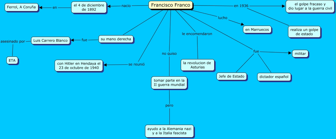 Este Cmap, tiene información relacionada con: 20.Raquel Moya Quintero-Franco, Francisco Franco su mano derecha, Francisco Franco no quiso tomar parte en la II guerra mundial, tomar parte en la II guerra mundial pero ayudo a la Alemania nazi y a la Italia fascista, Francisco Franco nacio el 4 de diciembre de 1892, Francisco Franco se reunió con Hitler en Hendaya el 23 de octubre de 1940, el 4 de diciembre de 1892 en Ferrol, A Coruña, Francisco Franco en 1936 realiza un golpe de estado, Francisco Franco le encomendaron la revolucion de Asturias, Luis Carrero Blanco asesinado por ETA, Francisco Franco fue Jefe de Estado, su mano derecha fue Luis Carrero Blanco, Francisco Franco fue militar, Francisco Franco en 1936 el golpe fracaso y dio lugar a la guerra civil, Francisco Franco lucho en Marruecos, Francisco Franco fue dictador español