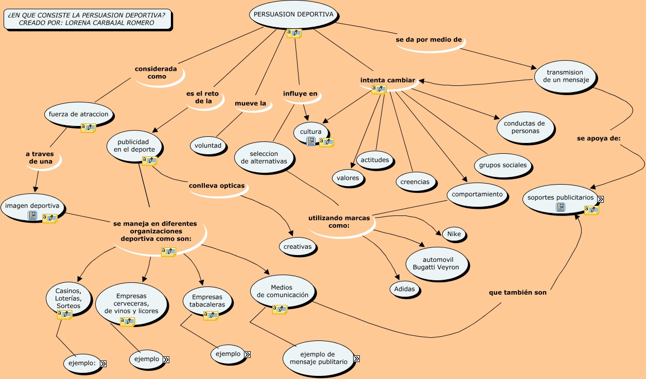 Este mapa conceptual tiene información relacionada a: PERSUASION, PERSUASION DEPORTIVA influye en seleccion de alternativas, fuerza de atraccion a traves de una imagen deportiva, publicidad en el deporte se maneja en diferentes organizaciones deportiva como son: Casinos, Loterías, Sorteos, PERSUASION DEPORTIVA intenta cambiar creencias, PERSUASION DEPORTIVA intenta cambiar valores, publicidad en el deporte se maneja en diferentes organizaciones deportiva como son: Empresas tabacaleras, transmision de un mensaje intenta cambiar actitudes, publicidad en el deporte conlleva opticas creativas, transmision de un mensaje se apoya de: soportes publicitarios, PERSUASION DEPORTIVA considerada como fuerza de atraccion