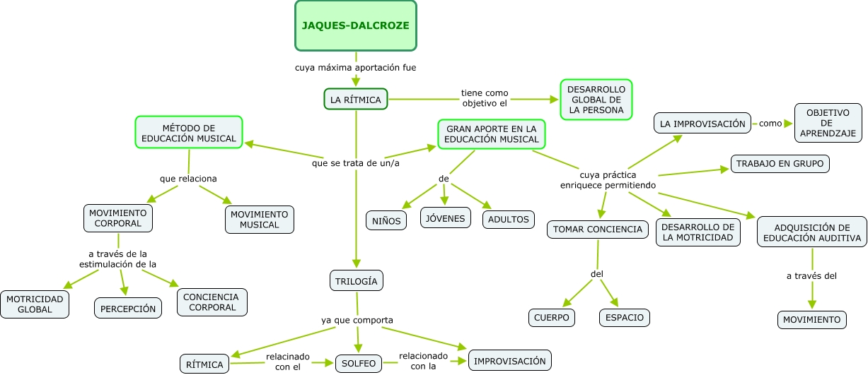 Este Cmap, tiene información relacionada con: DALCROZE, TRILOGÍA ya que comporta RÍTMICA, TOMAR CONCIENCIA del ESPACIO, GRAN APORTE EN LA EDUCACIÓN MUSICAL cuya práctica enriquece permitiendo TOMAR CONCIENCIA, RÍTMICA relacinado con el SOLFEO, MOVIMIENTO CORPORAL a través de la estimulación de la MOTRICIDAD GLOBAL, GRAN APORTE EN LA EDUCACIÓN MUSICAL cuya práctica enriquece permitiendo ADQUISICIÓN DE EDUCACIÓN AUDITIVA, LA IMPROVISACIÓN como OBJETIVO DE APRENDZAJE, ADQUISICIÓN DE EDUCACIÓN AUDITIVA a través del MOVIMIENTO, GRAN APORTE EN LA EDUCACIÓN MUSICAL de JÓVENES, LA RÍTMICA que se trata de un/a TRILOGÍA, TRILOGÍA ya que comporta IMPROVISACIÓN, JAQUES-DALCROZE cuya máxima aportación fue LA RÍTMICA, TOMAR CONCIENCIA del CUERPO, LA RÍTMICA tiene como objetivo el DESARROLLO GLOBAL DE LA PERSONA, GRAN APORTE EN LA EDUCACIÓN MUSICAL de NIÑOS, GRAN APORTE EN LA EDUCACIÓN MUSICAL cuya práctica enriquece permitiendo TRABAJO EN GRUPO, TRILOGÍA ya que comporta SOLFEO, LA RÍTMICA que se trata de un/a MÉTODO DE EDUCACIÓN MUSICAL, LA RÍTMICA que se trata de un/a GRAN APORTE EN LA EDUCACIÓN MUSICAL, GRAN APORTE EN LA EDUCACIÓN MUSICAL cuya práctica enriquece permitiendo DESARROLLO DE LA MOTRICIDAD
