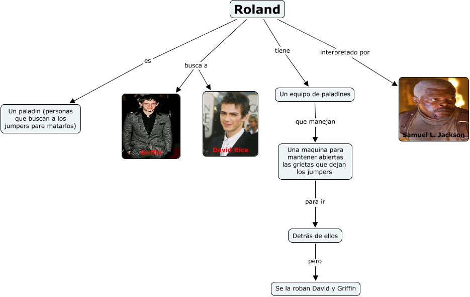Roland, Detrás de ellos pero Se la roban David y Griffin, Roland busca a Griffin, Un equipo de paladines que manejan Una maquina para mantener abiertas las grietas que dejan los jumpers, Roland interpretado por Samuel L. Jackson, Roland tiene Un equipo de paladines, Roland busca a David Rice, Una maquina para mantener abiertas las grietas que dejan los jumpers para ir Detrás de ellos, Roland es Un paladin (personas que buscan a los jumpers para matarlos)