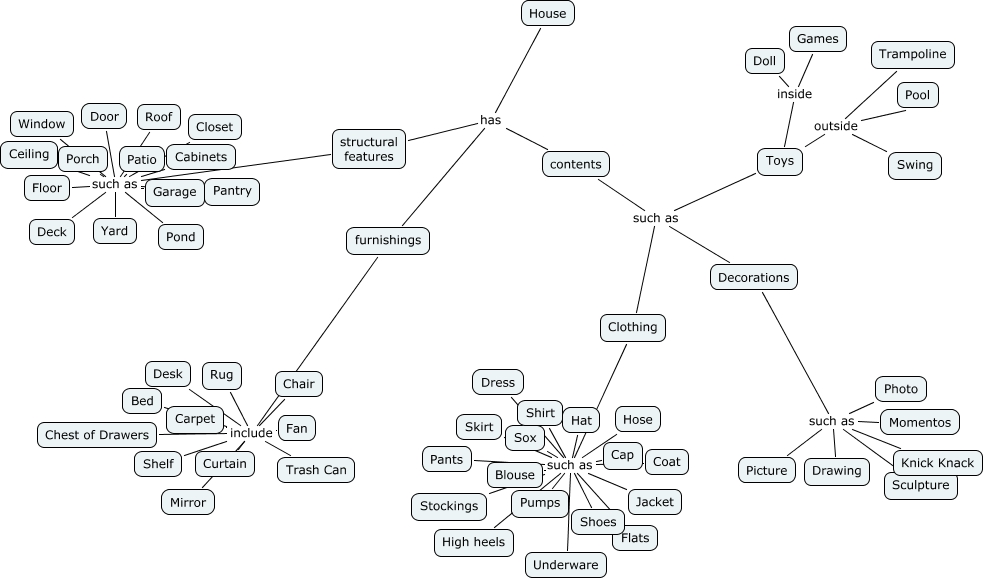 This Concept Map, created with IHMC CmapTools, has information related to: House, structural features such as Ceiling, Toys outside Swing, furnishings include Rug, structural features such as Pond, Clothing such as Hat, Toys outside Pool, Clothing such as Underware, Clothing such as Stockings, structural features such as Closet, Decorations such as Drawing, structural features such as Door, Clothing such as Hose, Clothing such as High heels, furnishings include Chair, structural features such as Window, structural features such as Pantry, structural features such as Cabinets, structural features such as Porch, Clothing such as Pumps, Decorations such as Photo