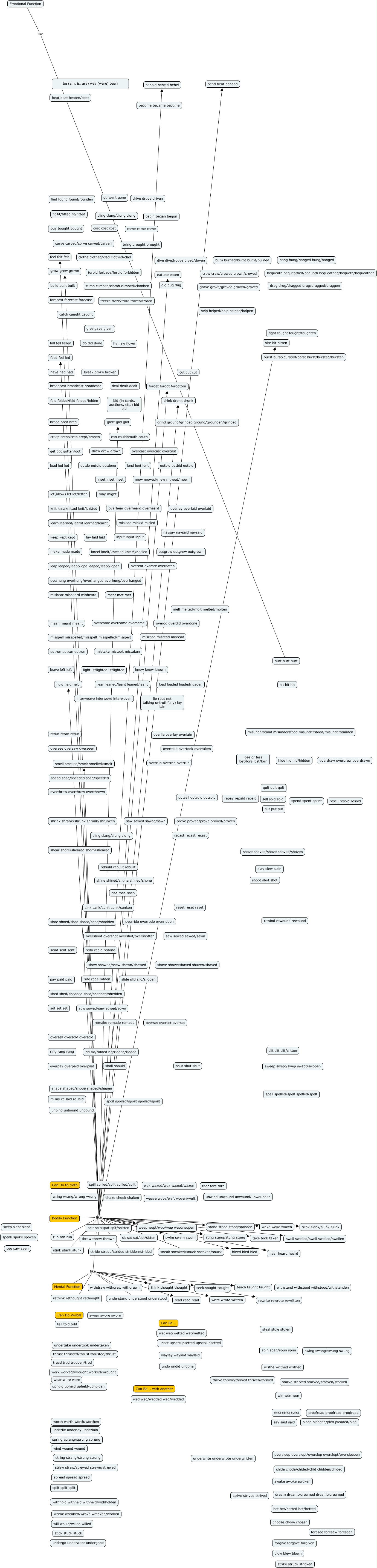 This Concept Map, created with IHMC CmapTools, has information related to: irregular verbs, Bodily Function like stand stood stood/standen, Bodily Function like spit spit/spat spit/spitten, Mental Function like seek sought sought, Emotional Function like hurt hurt hurt, Bodily Function like hold held held, Bodily Function like hear heard heard, Bodily Function like weep wept/wop/wep wept/wopen, Bodily Function like bleed bled bled, Mental Function like read read read, Bodily Function like stink stank stunk, Mental Function like rewrite rewrote rewritten, Bodily Function like grow grew grown, Mental Function like withdraw withdrew withdrawn, Bodily Function like take took taken, Bodily Function like feed fed fed, Bodily Function like drink drank drunk, Bodily Function like run ran run, Bodily Function like glide glid glid, Mental Function like teach taught taught, Bodily Function like throw threw thrown
