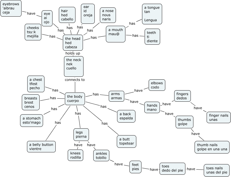 This Concept Map, created with IHMC CmapTools, has information related to: Body Parts 1, the head hed cabeza holds up the neck nek cuello, legs pierna have ankles tobillo, toes dedo del pie have toes nails unas del pie, arms armas have hands mano, hands mano have fingers dedos, the head hed cabeza has a nose nous naris, legs pierna have knees rodilla, the body cuerpo has a back espalda, the head hed cabeza has a mouth mau@, a mouth mau@ has teeth ti diente, the body cuerpo has a chest tfest pecho, the body cuerpo has a stomach esto'mago, the body cuerpo has legs pierna, the body cuerpo has breasts brest cenos, fingers dedos have finger nails unas, the head hed cabeza has eye ai ojo, the body cuerpo has a belly button vientre, arms armas have elbows codo, the body cuerpo has arms armas, hands mano have thumbs golpe