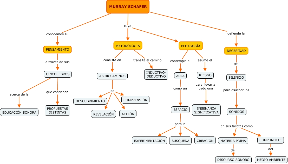 Este Cmap, tiene información relacionada con: SCHAFER, ABRIR CAMINOS de COMPRENSIÓN, SONIDOS en sus facetas como COMPONENTE, MURRAY SCHAFER cuya METODOLOGÍA, ABRIR CAMINOS de ACCIÓN, MATERIA PRIMA del DISCURSO SONORO, PEDAGOGÍA contempla el AULA, MURRAY SCHAFER defiende la NECESIDAD, PENSAMIENTO a través de sus CINCO LIBROS, ESPACIO para la CREACIÓN, METODOLOGÍA consiste en ABRIR CAMINOS, ESPACIO para la BÚSQUEDA, ABRIR CAMINOS de REVELACIÓN, MURRAY SCHAFER conocemos su PENSAMIENTO, SONIDOS en sus facetas como MATERIA PRIMA, CINCO LIBROS que contienen PROPUESTAS DISTINTAS, AULA como un ESPACIO, RIESGO para llevar a cado una ENSEÑANZA SIGNIFICATIVA, METODOLOGÍA transita el camino INDUCTIVO- DEDUCTIVO, COMPONENTE del MEDIO AMBIENTE, ESPACIO para la EXPERIMENTACIÓN