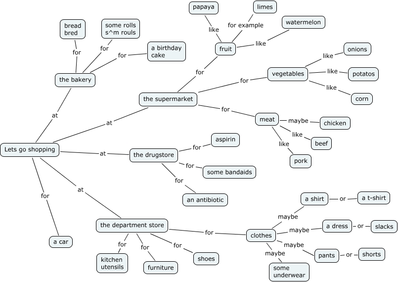 This Concept Map, created with IHMC CmapTools, has information related to: Shopping, the department store for shoes, the department store for clothes, fruit for example limes, the supermarket for vegetables, fruit like watermelon, Lets go shopping at the drugstore, the department store for furniture, the drugstore for an antibiotic, fruit like papaya, the bakery for a birthday cake, a dress or slacks, clothes maybe a dress, Lets go shopping at the bakery, the drugstore for aspirin, a shirt or a t-shirt, vegetables like onions, the bakery for bread bred, the department store for kitchen utensils, the bakery for some rolls s^m rouls, vegetables like corn