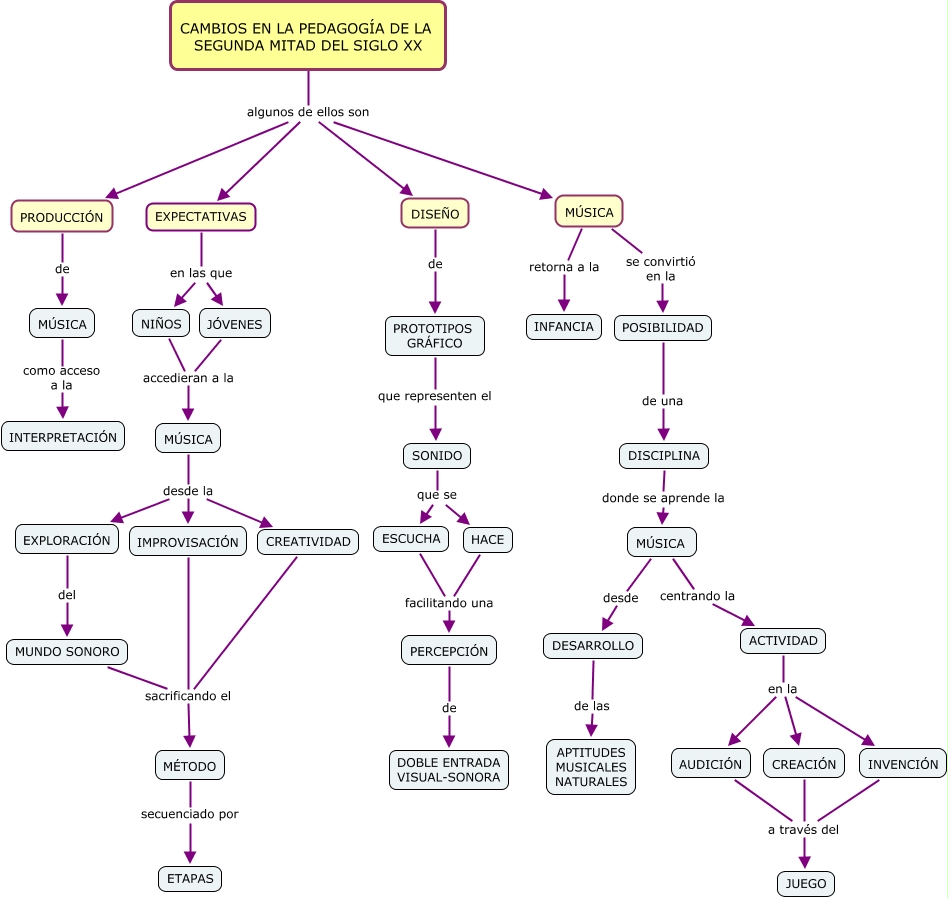 Este Cmap, tiene información relacionada con: PEDAGO.CAMBIOS, PERCEPCIÓN de DOBLE ENTRADA VISUAL-SONORA, AUDICIÓN a través del JUEGO, MÉTODO secuenciado por ETAPAS, IMPROVISACIÓN sacrificando el MÉTODO, CAMBIOS EN LA PEDAGOGÍA DE LA SEGUNDA MITAD DEL SIGLO XX algunos de ellos son PRODUCCIÓN, HACE facilitando una PERCEPCIÓN, MUNDO SONORO sacrificando el MÉTODO, MÚSICA centrando la ACTIVIDAD, INVENCIÓN a través del JUEGO, ESCUCHA facilitando una PERCEPCIÓN, SONIDO que se ESCUCHA, NIÑOS accedieran a la MÚSICA, POSIBILIDAD de una DISCIPLINA, MÚSICA retorna a la INFANCIA, CREACIÓN a través del JUEGO, EXPLORACIÓN del MUNDO SONORO, PROTOTIPOS GRÁFICO que representen el SONIDO, DISEÑO de PROTOTIPOS GRÁFICO, SONIDO que se HACE, EXPECTATIVAS en las que NIÑOS