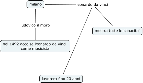 Questa Cmap, creata con IHMC CmapTools, contiene informazioni relative a: milano, milano leonardo da vinci lavorera fino 20 anni, milano leonardo da vinci mostra tutte le capacita', milano ludovico il moro nel 1492 accolse leonardo da vinci come musicista