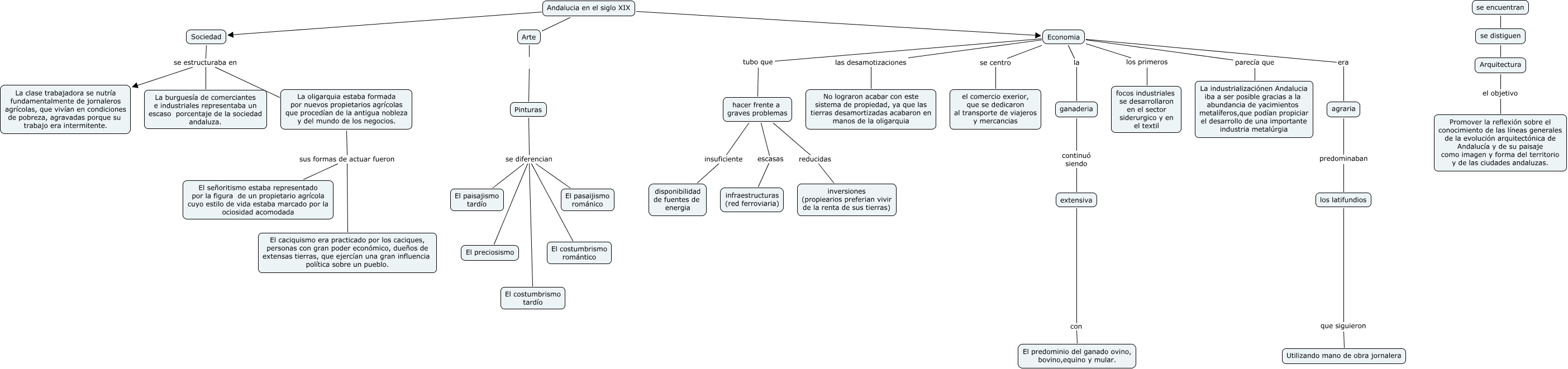 Este Cmap, tiene información relacionada con: 21.Pepe Romero Morales. Recuperacion del 2 trimestre, Economia los primeros focos industriales se desarrollaron en el sector siderurgico y en el textil, hacer frente a graves problemas insuficiente disponibilidad de fuentes de energia, La oligarquia estaba formada por nuevos propietarios agrícolas que procedían de la antigua nobleza y del mundo de los negocios. sus formas de actuar fueron El caciquismo era practicado por los caciques, personas con gran poder económico, dueños de extensas tierras, que ejercían una gran influencia política sobre un pueblo., Arte Pinturas, Arquitectura el objetivo Promover la reflexión sobre el conocimiento de las líneas generales de la evolución arquitectónica de Andalucía y de su paisaje como imagen y forma del territorio y de las ciudades andaluzas., Sociedad se estructuraba en La clase trabajadora se nutría fundamentalmente de jornaleros agrícolas, que vivían en condiciones de pobreza, agravadas porque su trabajo era intermitente., Economia se centro el comercio exerior, que se dedicaron al transporte de viajeros y mercancias, Pinturas se diferencian El costumbrismo tardío, hacer frente a graves problemas escasas infraestructuras (red ferroviaria), Economia parecía que La industrializaciónen Andalucia iba a ser posible gracias a la abundancia de yacimientos metalíferos,que podían propiciar el desarrollo de una importante industria metalúrgia, Andalucia en el siglo XIX Sociedad, los latifundios que siguieron Utilizando mano de obra jornalera, Pinturas se diferencian El paisajismo tardío, extensiva con El predominio del ganado ovino, bovino,equino y mular., Pinturas se diferencian El pasaijismo románico, Pinturas se diferencian El costumbrismo romántico, Economia tubo que hacer frente a graves problemas, ganaderia continuó siendo extensiva, hacer frente a graves problemas reducidas inversiones (propiearios preferian vivir de la renta de sus tierras), se distiguen Arquitectura