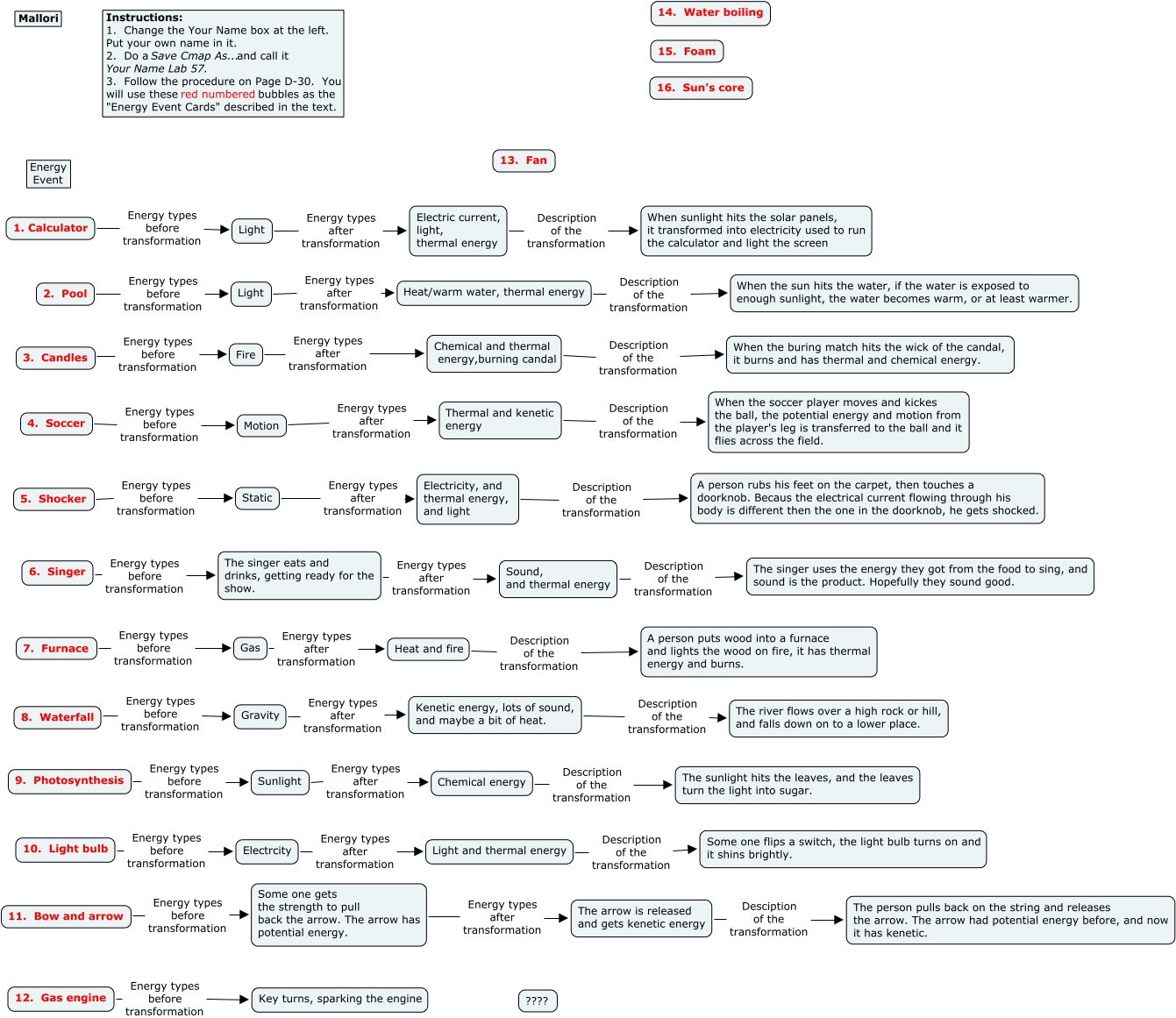 This Concept Map, created with IHMC CmapTools, has information related to: Mallori 58, 10. Light bulb Energy types before transformation Electrcity, Light Energy types after transformation Heat/warm water, thermal energy, 11. Bow and arrow Energy types before transformation Some one gets the strength to pull back the arrow. The arrow has potential energy., Gas Energy types after transformation Heat and fire, Heat and fire Description of the transformation A person puts wood into a furnace and lights the wood on fire, it has thermal energy and burns., Motion Energy types after transformation Thermal and kenetic energy, The arrow is released and gets kenetic energy Desciption of the transformation The person pulls back on the string and releases the arrow. The arrow had potential energy before, and now it has kenetic., Electric current, light, thermal energy Description of the transformation When sunlight hits the solar panels, it transformed into electricity used to run the calculator and light the screen, Electrcity Energy types after transformation Light and thermal energy, Thermal and kenetic energy Description of the transformation When the soccer player moves and kickes the ball, the potential energy and motion from the player's leg is transferred to the ball and it flies across the field., Sound, and thermal energy Description of the transformation The singer uses the energy they got from the food to sing, and sound is the product. Hopefully they sound good., The singer eats and drinks, getting ready for the show. Energy types after transformation Sound, and thermal energy, 8. Waterfall Energy types before transformation Gravity, Chemical energy Description of the transformation The sunlight hits the leaves, and the leaves turn the light into sugar., Light Energy types after transformation Electric current, light, thermal energy, Heat/warm water, thermal energy Description of the transformation When the sun hits the water, if the water is exposed to enough sunlight, the water becomes warm, or at least warmer., 2. Pool Energy types before transformation Light, Static Energy types after transformation Electricity, and thermal energy, and light, Chemical and thermal energy,burning candal Description of the transformation When the buring match hits the wick of the candal, it burns and has thermal and chemical energy., 3. Candles Energy types before transformation Fire