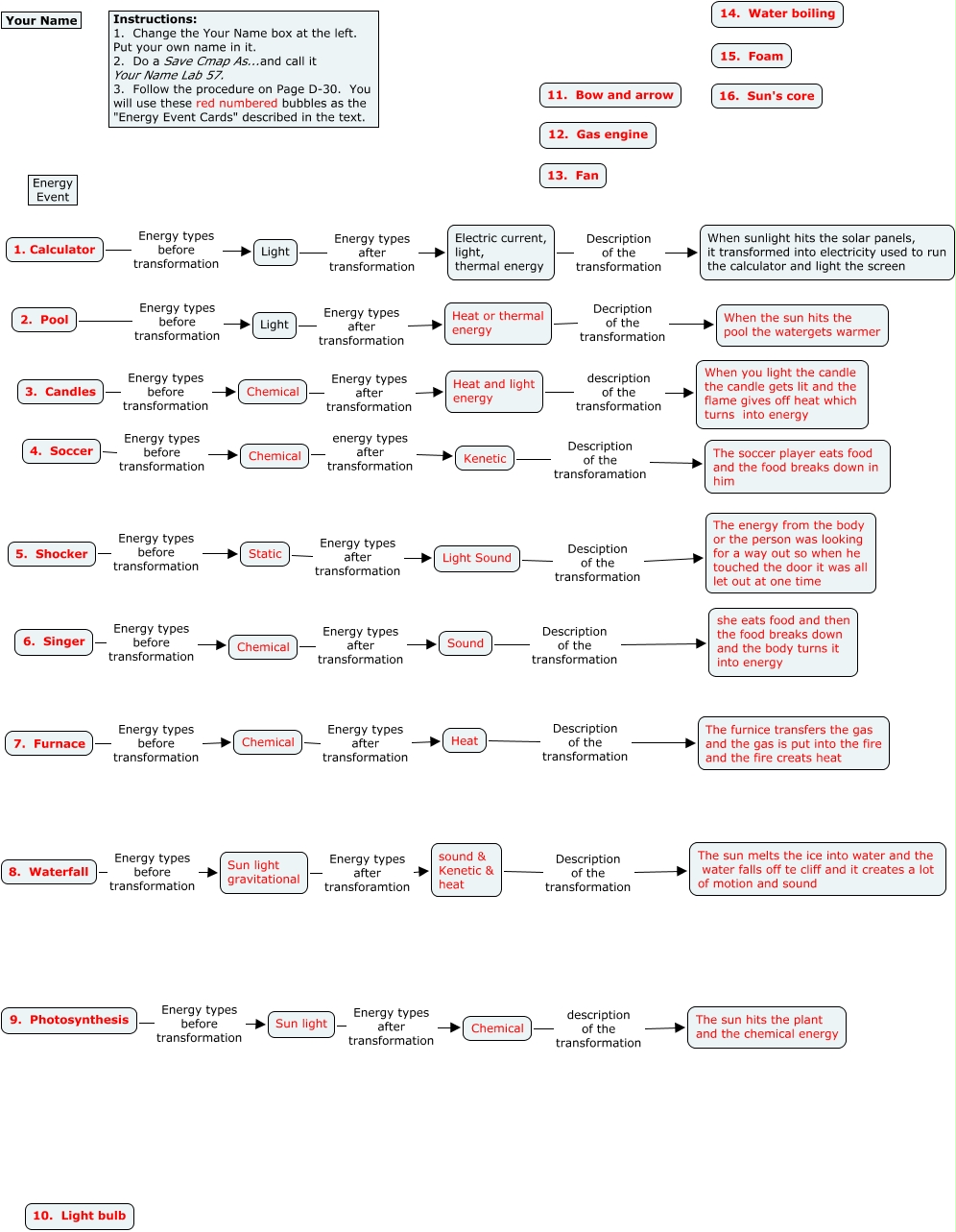 This Concept Map, created with IHMC CmapTools, has information related to: Melissa Lab 58, Sound Description of the transformation she eats food and then the food breaks down and the body turns it into energy, 3. Candles Energy types before transformation Chemical, Heat or thermal energy Decription of the transformation When the sun hits the pool the watergets warmer, Chemical Energy types after transformation Heat, 6. Singer Energy types before transformation Chemical, Light Sound Desciption of the transformation The energy from the body or the person was looking for a way out so when he touched the door it was all let out at one time, Electric current, light, thermal energy Description of the transformation When sunlight hits the solar panels, it transformed into electricity used to run the calculator and light the screen, Chemical energy types after transformation Kenetic, 7. Furnace Energy types before transformation Chemical, sound & Kenetic & heat Description of the transformation The sun melts the ice into water and the water falls off te cliff and it creates a lot of motion and sound, 5. Shocker Energy types before transformation Static, 2. Pool Energy types before transformation Light, Light Energy types after transformation Heat or thermal energy, Kenetic Description of the transforamation The soccer player eats food and the food breaks down in him, Chemical Energy types after transformation Sound, Static Energy types after transformation Light Sound, Chemical description of the transformation The sun hits the plant and the chemical energy, 1. Calculator Energy types before transformation Light, Light Energy types after transformation Electric current, light, thermal energy, Sun light Energy types after transformation Chemical