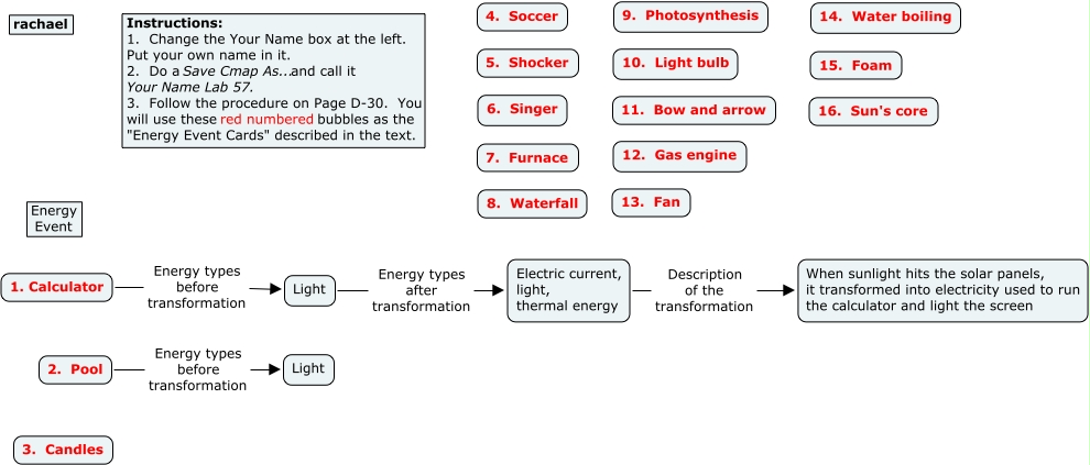 This Concept Map, created with IHMC CmapTools, has information related to: rachael Lab 58, Light Energy types after transformation Electric current, light, thermal energy, 1. Calculator Energy types before transformation Light, 2. Pool Energy types before transformation Light, Electric current, light, thermal energy Description of the transformation When sunlight hits the solar panels, it transformed into electricity used to run the calculator and light the screen