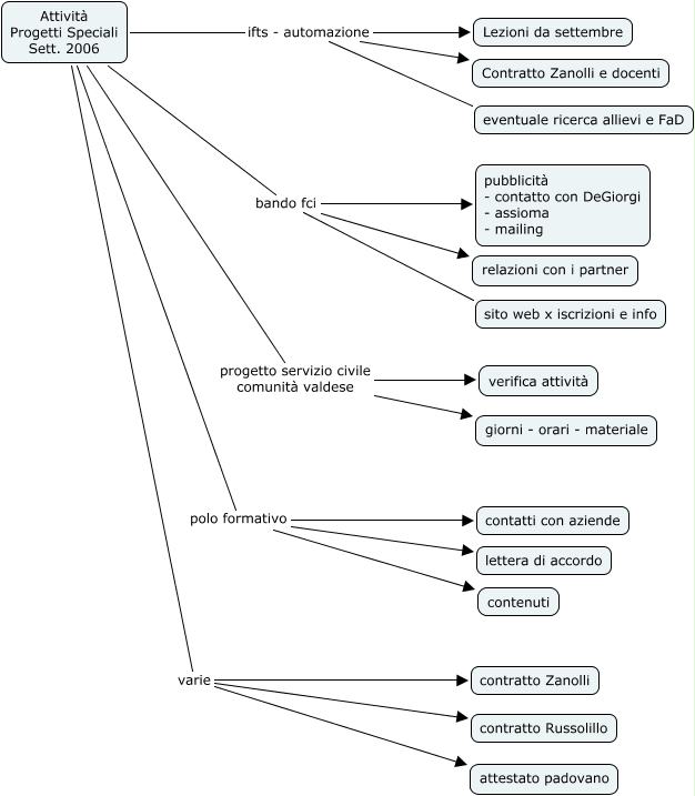 Questa Cmap, creata con IHMC CmapTools, contiene informazioni relative a: To Do Progetti Speciali sett2006, Attività Progetti Speciali Sett. 2006 progetto servizio civile comunità valdese giorni - orari - materiale, Attività Progetti Speciali Sett. 2006 varie contratto Zanolli, Attività Progetti Speciali Sett. 2006 varie attestato padovano, Attività Progetti Speciali Sett. 2006 ifts - automazione Lezioni da settembre, Attività Progetti Speciali Sett. 2006 bando fci pubblicità - contatto con DeGiorgi - assioma - mailing, Attività Progetti Speciali Sett. 2006 ifts - automazione eventuale ricerca allievi e FaD, Attività Progetti Speciali Sett. 2006 polo formativo contenuti, Attività Progetti Speciali Sett. 2006 progetto servizio civile comunità valdese verifica attività, Attività Progetti Speciali Sett. 2006 bando fci sito web x iscrizioni e info, Attività Progetti Speciali Sett. 2006 polo formativo lettera di accordo, Attività Progetti Speciali Sett. 2006 bando fci relazioni con i partner, Attività Progetti Speciali Sett. 2006 ifts - automazione Contratto Zanolli e docenti, Attività Progetti Speciali Sett. 2006 varie contratto Russolillo, Attività Progetti Speciali Sett. 2006 polo formativo contatti con aziende