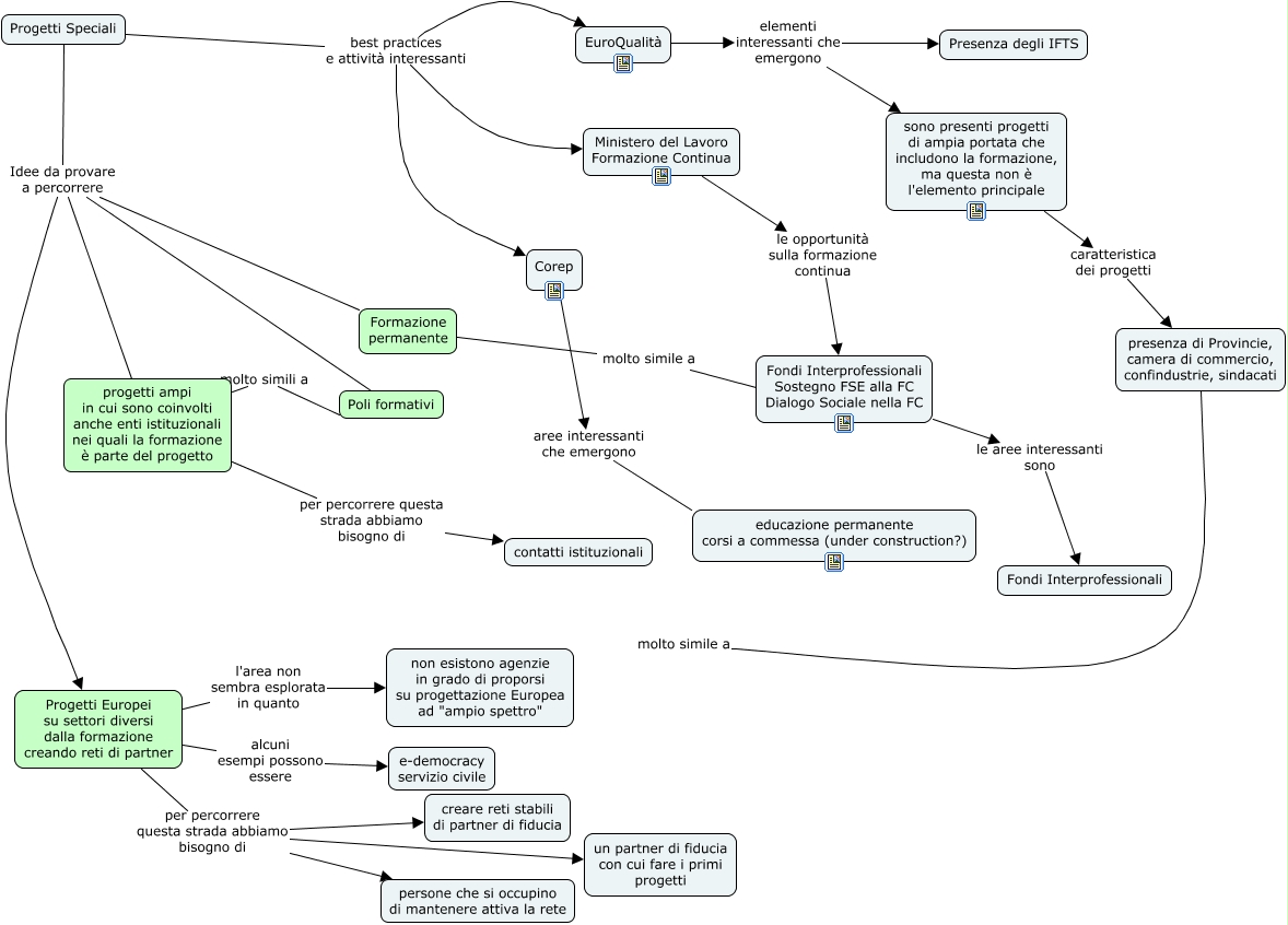 Questa Cmap, creata con IHMC CmapTools, contiene informazioni relative a: Aree Strategiche Progetti Speciali, progetti ampi in cui sono coinvolti anche enti istituzionali nei quali la formazione è parte del progetto molto simili a Poli formativi, Progetti Speciali Idee da provare a percorrere Progetti Europei su settori diversi dalla formazione creando reti di partner, Progetti Speciali best practices e attività interessanti Ministero del Lavoro Formazione Continua, Progetti Europei su settori diversi dalla formazione creando reti di partner l'area non sembra esplorata in quanto non esistono agenzie in grado di proporsi su progettazione Europea ad "ampio spettro", Formazione permanente molto simile a Fondi Interprofessionali Sostegno FSE alla FC Dialogo Sociale nella FC, Progetti Europei su settori diversi dalla formazione creando reti di partner per percorrere questa strada abbiamo bisogno di un partner di fiducia con cui fare i primi progetti, Progetti Speciali Idee da provare a percorrere Formazione permanente, Progetti Speciali best practices e attività interessanti EuroQualità, Corep aree interessanti che emergono educazione permanente corsi a commessa (under construction?), sono presenti progetti di ampia portata che includono la formazione, ma questa non è l'elemento principale caratteristica dei progetti presenza di Provincie, camera di commercio, confindustrie, sindacati, progetti ampi in cui sono coinvolti anche enti istituzionali nei quali la formazione è parte del progetto molto simile a presenza di Provincie, camera di commercio, confindustrie, sindacati, EuroQualità elementi interessanti che emergono Presenza degli IFTS, Progetti Speciali best practices e attività interessanti Corep, progetti ampi in cui sono coinvolti anche enti istituzionali nei quali la formazione è parte del progetto per percorrere questa strada abbiamo bisogno di contatti istituzionali, Ministero del Lavoro Formazione Continua le opportunità sulla formazione continua Fondi Interprofessionali Sostegno FSE alla FC Dialogo Sociale nella FC, EuroQualità elementi interessanti che emergono sono presenti progetti di ampia portata che includono la formazione, ma questa non è l'elemento principale, Fondi Interprofessionali Sostegno FSE alla FC Dialogo Sociale nella FC le aree interessanti sono Fondi Interprofessionali, Progetti Europei su settori diversi dalla formazione creando reti di partner per percorrere questa strada abbiamo bisogno di creare reti stabili di partner di fiducia, Progetti Europei su settori diversi dalla formazione creando reti di partner alcuni esempi possono essere e-democracy servizio civile, Progetti Speciali Idee da provare a percorrere Poli formativi