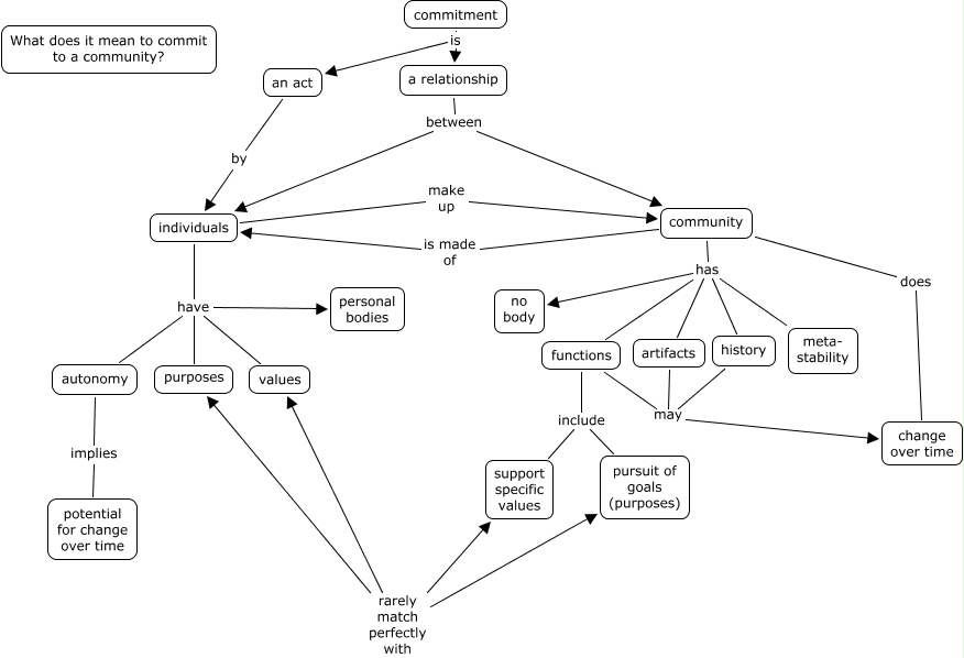 This Concept Map, created with IHMC CmapTools, has information related to: commitment_problem of community, commitment is an act, individuals have purposes, functions include support specific values, a relationship between community, an act by individuals, individuals have personal bodies, artifacts may change over time, community does change over time, autonomy implies potential for change over time, community has history, commitment is a relationship, functions include pursuit of goals (purposes), community has artifacts, individuals have autonomy, community has meta- stability, individuals have values, community has no body, community has functions, history may change over time, functions may change over time