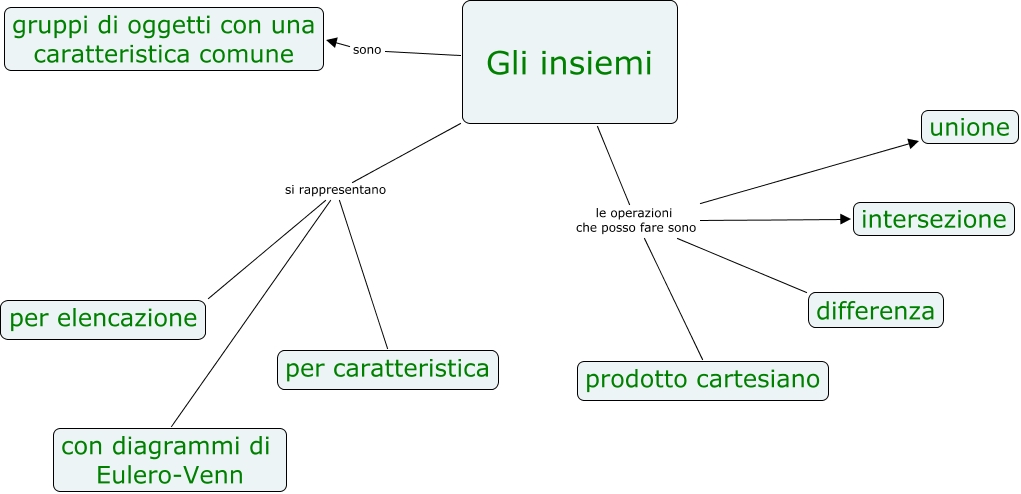 Questa Mappa Concettuale ha informazioni correlate a: GLI INSIEMI_gruppo1, Gli insiemi le operazioni che posso fare sono prodotto cartesiano, Gli insiemi le operazioni che posso fare sono intersezione, Gli insiemi le operazioni che posso fare sono unione, Gli insiemi le operazioni che posso fare sono differenza, Gli insiemi si rappresentano con diagrammi di Eulero-Venn, Gli insiemi sono gruppi di oggetti con una caratteristica comune, Gli insiemi si rappresentano per elencazione, Gli insiemi si rappresentano per caratteristica