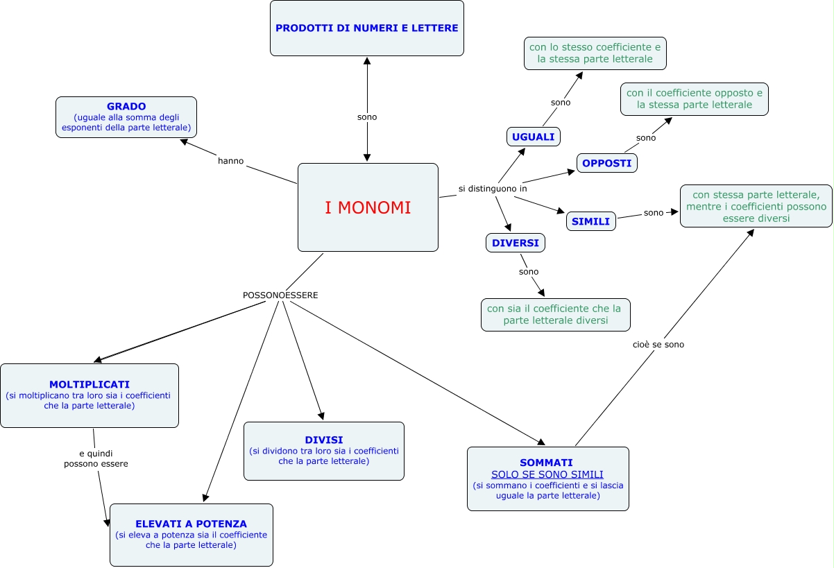 Questa Mappa Concettuale ha informazioni correlate a: I MONOMI_gruppo3, UGUALI sono con lo stesso coefficiente e la stessa parte letterale, I MONOMI hanno GRADO (uguale alla somma degli esponenti della parte letterale), I MONOMI si distinguono in OPPOSTI, I MONOMI POSSONOESSERE MOLTIPLICATI (si moltiplicano tra loro sia i coefficienti che la parte letterale), I MONOMI POSSONOESSERE ELEVATI A POTENZA (si eleva a potenza sia il coefficiente che la parte letterale), I MONOMI POSSONOESSERE MOLTIPLICATI (si moltiplicano tra loro sia i coefficienti che la parte letterale), OPPOSTI sono con il coefficiente opposto e la stessa parte letterale, I MONOMI si distinguono in SIMILI, SOMMATI SOLO SE SONO SIMILI (si sommano i coefficienti e si lascia uguale la parte letterale) cioè se sono con stessa parte letterale, mentre i coefficienti possono essere diversi, I MONOMI POSSONOESSERE SOMMATI SOLO SE SONO SIMILI (si sommano i coefficienti e si lascia uguale la parte letterale), I MONOMI POSSONOESSERE DIVISI (si dividono tra loro sia i coefficienti che la parte letterale), MOLTIPLICATI (si moltiplicano tra loro sia i coefficienti che la parte letterale) e quindi possono essere ELEVATI A POTENZA (si eleva a potenza sia il coefficiente che la parte letterale), SIMILI sono con stessa parte letterale, mentre i coefficienti possono essere diversi, I MONOMI si distinguono in DIVERSI, DIVERSI sono con sia il coefficiente che la parte letterale diversi, I MONOMI si distinguono in UGUALI