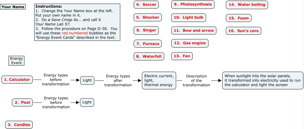 This Concept Map, created with IHMC CmapTools, has information related to: YourName Lab 57 Master, Light Energy types after transformation Electric current, light, thermal energy, 2. Pool Energy types before transformation Light, 1. Calculator Energy types before transformation Light, Electric current, light, thermal energy Description of the transformation When sunlight hits the solar panels, it transformed into electricity used to run the calculator and light the screen