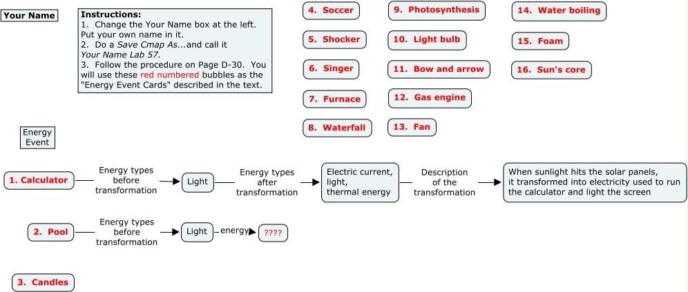 This Concept Map, created with IHMC CmapTools, has information related to: jesse lab58, Light energy ????, Light Energy types after transformation Electric current, light, thermal energy, 2. Pool Energy types before transformation Light, 1. Calculator Energy types before transformation Light, Electric current, light, thermal energy Description of the transformation When sunlight hits the solar panels, it transformed into electricity used to run the calculator and light the screen