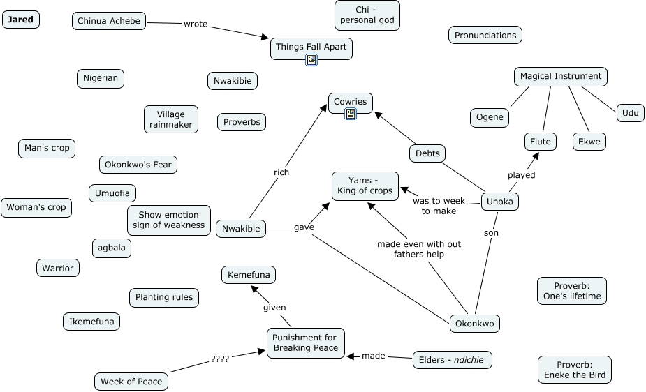 This Concept Map, created with IHMC CmapTools, has information related to: Fall Apart Master 1jared, Magical Instrument ???? Ekwe, Punishment for Breaking Peace given Kemefuna, Chinua Achebe wrote Things Fall Apart, Unoka son Okonkwo, Magical Instrument ???? Ogene, Week of Peace ???? Punishment for Breaking Peace, Nwakibie gave Yams - King of crops, Nwakibie gave Okonkwo, Nwakibie rich Cowries, Magical Instrument ???? Udu, Unoka played Flute, Elders - ndichie made Punishment for Breaking Peace, Magical Instrument ???? Flute, Unoka ???? Cowries, Unoka was to week to make Yams - King of crops, Okonkwo made even with out fathers help Yams - King of crops