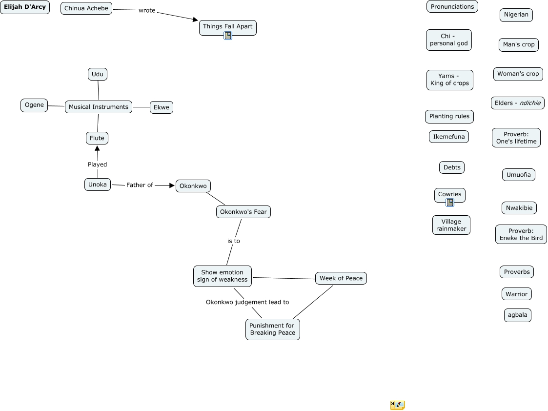 This Concept Map, created with IHMC CmapTools, has information related to: Elijah D'Arcy, Musical Instruments ???? Ogene, Musical Instruments ???? Flute, Unoka Played Flute, Unoka Father of Okonkwo, Okonkwo ???? Okonkwo's Fear, Okonkwo's Fear is to Show emotion sign of weakness, Show emotion sign of weakness ???? Week of Peace, Chinua Achebe wrote Things Fall Apart, Musical Instruments ???? Udu, Musical Instruments ???? Ekwe, Show emotion sign of weakness Okonkwo judgement lead to Punishment for Breaking Peace, Week of Peace ???? Punishment for Breaking Peace