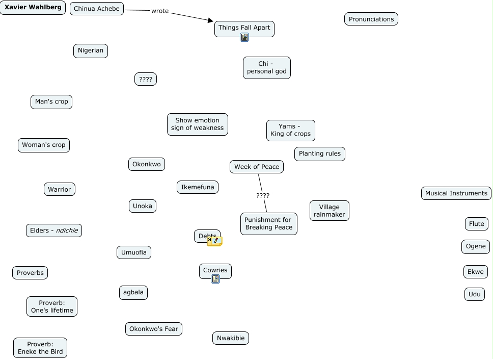 This Concept Map, created with IHMC CmapTools, has information related to: xavier wahlberg, Week of Peace ???? Punishment for Breaking Peace, Chinua Achebe wrote Things Fall Apart