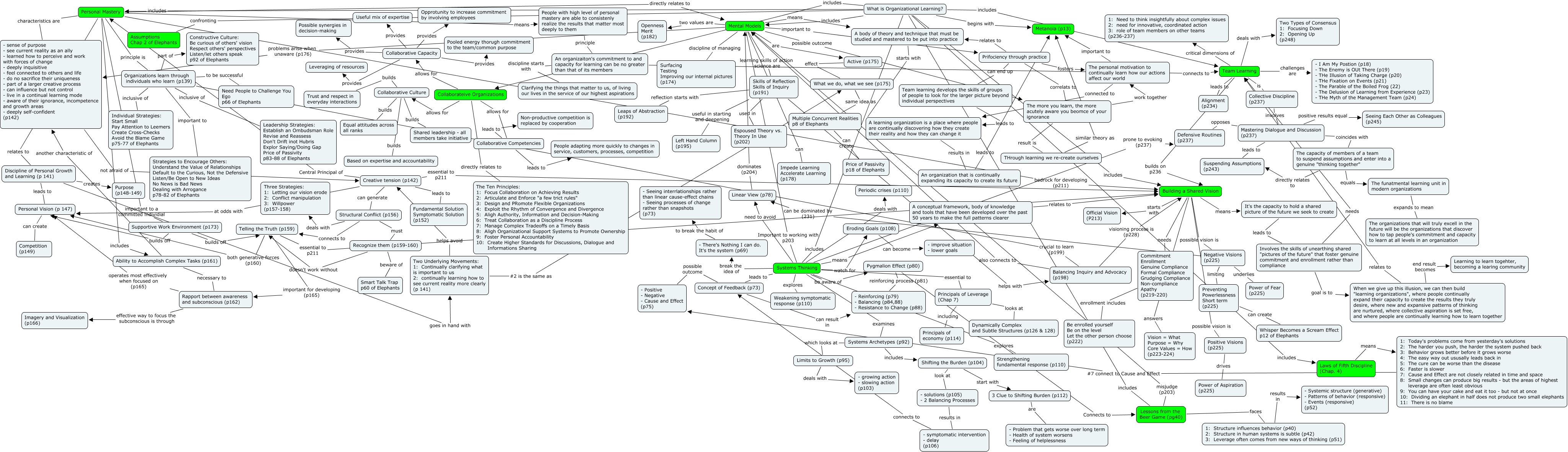 This Concept Map, created with IHMC CmapTools, has information related to: Final direct reports, Organizations learn through individuals who learn (p139) to be successful Need People to Challenge You Ego p66 of Elephants, Systems Thinking explores Strengthening fundamental response (p110), Organizations learn through individuals who learn (p139) inclusive of Individual Strategies: Start Small Pay Attention to Leemers Create Cross-Checks Avoid the Blame Game p75-77 of Elephants, Collaborative Culture builds Trust and respect in everyday interactions, What is Organizational Learning? includes Lessons from the Beer Game (pg40), Mental Models learning skills of action science are Skills of Reflection Skills of Inquiry (p191), An organizaiton's commitment to and capacity for learning can be no greater than that of its members discipline starts with Clarifying the things that matter to us, of living our lives in the service of our highest aspirations, A body of theory and technique that must be studied and mastered to be put into practice starts wtih A learning organization is a place where people are continually discovering how they create their reality and how they can change it, Rapport between awareness and subconscious (p162) effective way to focus the subconscious is through Imagery and Visualization (p166), What is Organizational Learning? includes Building a Shared Vision, The funatmental learning unit in modern organizations expands to mean The organizations that will truly excell in the future will be the organizations that discover how to tap people's commitment and capacity to learn at all levels in an organization, A conceptual framework, body of knowledge and tools that have been developed over the past 50 years to make the full patterns clearer relates to Building a Shared Vision, The capacity of members of a team to suspend assumptions and enter into a genuine "thinking together" equals The funatmental learning unit in modern organizations, Prifociency through practice correlats to The more you learn, the more acutely aware you beomce of your ignorance, The capacity of members of a team to suspend assumptions and enter into a genuine "thinking together" directly relates to Suspending Assumptions (p243), Two Underlying Movements: 1: Continually clarifying what is important to us 2: continually learning how to see current reality more clearly (p 141) #2 is the same as What we do, what we see (p175), Organizations learn through individuals who learn (p139) inclusive of Leadership Strategies: Establish an Ombudsman Role Revise and Reassess Don't Drift inot Hubris Explor Saying/Doing Gap Price of Passivity p83-88 of Elephants, What is Organizational Learning? includes Systems Thinking, Systems Thinking means A conceptual framework, body of knowledge and tools that have been developed over the past 50 years to make the full patterns clearer, Systems Thinking need to avoid Linear View (p78)