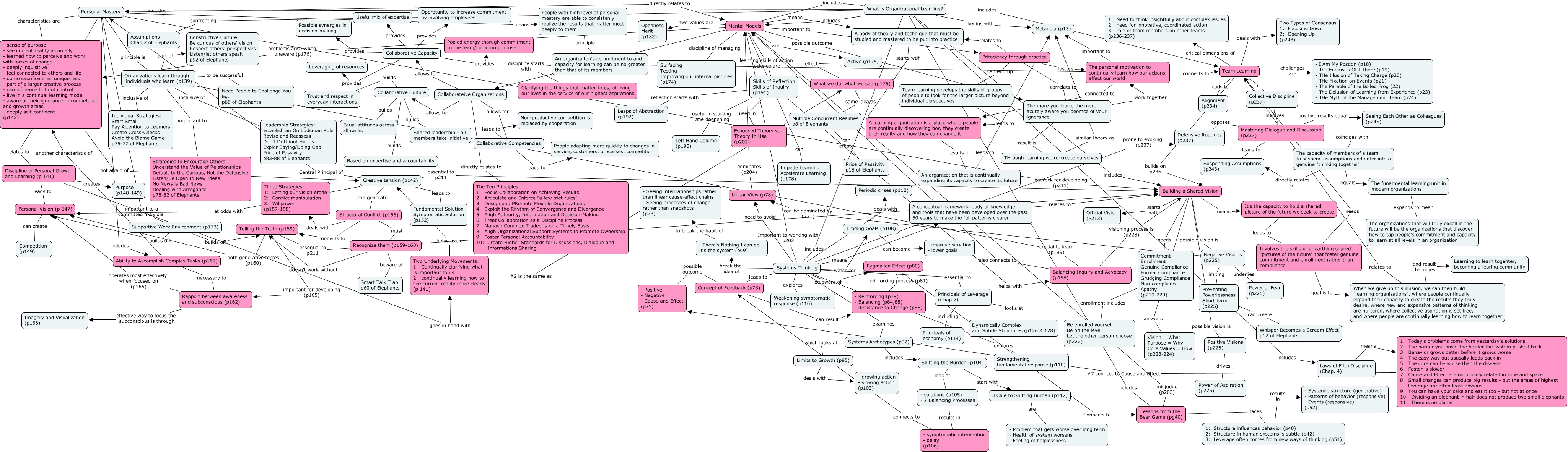 This Concept Map, created with IHMC CmapTools, has information related to: Final Connectors, Organizations learn through individuals who learn (p139) inclusive of Individual Strategies: Start Small Pay Attention to Leemers Create Cross-Checks Avoid the Blame Game p75-77 of Elephants, Systems Thinking explores Strengthening fundamental response (p110), Organizations learn through individuals who learn (p139) to be successful Need People to Challenge You Ego p66 of Elephants, What is Organizational Learning? includes Lessons from the Beer Game (pg40), Collaborative Culture builds Trust and respect in everyday interactions, Mental Models learning skills of action science are Skills of Reflection Skills of Inquiry (p191), What is Organizational Learning? includes Building a Shared Vision, Rapport between awareness and subconscious (p162) effective way to focus the subconscious is through Imagery and Visualization (p166), A body of theory and technique that must be studied and mastered to be put into practice starts wtih A learning organization is a place where people are continually discovering how they create their reality and how they can change it, An organizaiton's commitment to and capacity for learning can be no greater than that of its members discipline starts with Clarifying the things that matter to us, of living our lives in the service of our highest aspirations, A conceptual framework, body of knowledge and tools that have been developed over the past 50 years to make the full patterns clearer relates to Building a Shared Vision, The funatmental learning unit in modern organizations expands to mean The organizations that will truly excell in the future will be the organizations that discover how to tap people's commitment and capacity to learn at all levels in an organization, The capacity of members of a team to suspend assumptions and enter into a genuine "thinking together" equals The funatmental learning unit in modern organizations, Organizations learn through individuals who learn (p139) inclusive of Leadership Strategies: Establish an Ombudsman Role Revise and Reassess Don't Drift inot Hubris Explor Saying/Doing Gap Price of Passivity p83-88 of Elephants, Two Underlying Movements: 1: Continually clarifying what is important to us 2: continually learning how to see current reality more clearly (p 141) #2 is the same as What we do, what we see (p175), The capacity of members of a team to suspend assumptions and enter into a genuine "thinking together" directly relates to Suspending Assumptions (p243), Prifociency through practice correlats to The more you learn, the more acutely aware you beomce of your ignorance, What is Organizational Learning? includes Systems Thinking, Skills of Reflection Skills of Inquiry (p191) used in Espoused Theory vs. Theory In Use (p202), Mental Models discipline of managing Surfacing Testing Improving our internal pictures (p174)