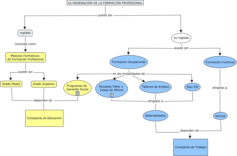 Este Cmap, tiene información relacionada con: La Ordenación de la Formación Profesional, Formación Ocupacional en las modalidades de Programas de Garantía Social, LA ORDENACIÓN DE LA FORMACIÓN PROFESIONAL puede ser reglada, Módulos Formativos de Formación Profesional puede ser Grado Medio, Formación Ocupacional en las modalidades de Plan FIP, Grado Superior dependen de Consejería de Educación, Plan FIP dirigidos a desempleados, no reglada puede ser Formación Ocupacional, Grado Medio dependen de Consejería de Educación, LA ORDENACIÓN DE LA FORMACIÓN PROFESIONAL puede ser no reglada, no reglada puede ser Formación Continua, reglada conocida como Módulos Formativos de Formación Profesional, Escuelas Taller y Casas de Oficios dirigidos a desempleados, Módulos Formativos de Formación Profesional puede ser Grado Superior, Talleres de Empleo dirigidos a desempleados, activos dependen de Consejería de Trabajo, Formación Ocupacional en las modalidades de Escuelas Taller y Casas de Oficios, Formación Ocupacional en las modalidades de Talleres de Empleo, desempleados dependen de Consejería de Trabajo, Formación Continua dirigidos a activos, Programas de Garantía Social dependen de Consejería de Educación