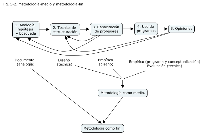 Este Cmap, tiene información relacionada con: Fig 5-2. Metodología-medio y metodología-fin, Metodología como medio. . Metodología como fin., 3. Capacitación de profesores ???? 1. Analogía, hipótesis y búsqueda, 3. Capacitación de profesores ???? 4. Uso de programas, Diseño (técnica) . Metodología como medio., 1. Analogía, hipótesis y búsqueda ???? 2. Técnica de estructuración, 2. Técnica de estructuración ???? 3. Capacitación de profesores, 5. Opiniones ???? 2. Técnica de estructuración, Empírico (diseño) . Metodología como medio., Documental (analogía) ???? Metodología como fin., 5. Opiniones ???? 1. Analogía, hipótesis y búsqueda, 3. Capacitación de profesores ???? 2. Técnica de estructuración, Empírico (programa y conceptualización) Evaluación (técnica) . Metodología como medio., 4. Uso de programas ???? 5. Opiniones