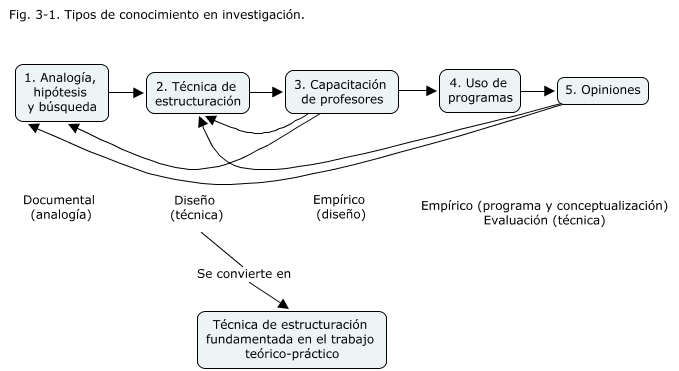 Este Cmap, tiene información relacionada con: Fig 3-1. Tipos de conocimiento en investigación, 3. Capacitación de profesores ???? 1. Analogía, hipótesis y búsqueda, 3. Capacitación de profesores ???? 4. Uso de programas, 1. Analogía, hipótesis y búsqueda ???? 2. Técnica de estructuración, 2. Técnica de estructuración ???? 3. Capacitación de profesores, Diseño (técnica) Se convierte en Técnica de estructuración fundamentada en el trabajo teórico-práctico, 5. Opiniones ???? 2. Técnica de estructuración, 5. Opiniones ???? 1. Analogía, hipótesis y búsqueda, 3. Capacitación de profesores ???? 2. Técnica de estructuración, 4. Uso de programas ???? 5. Opiniones