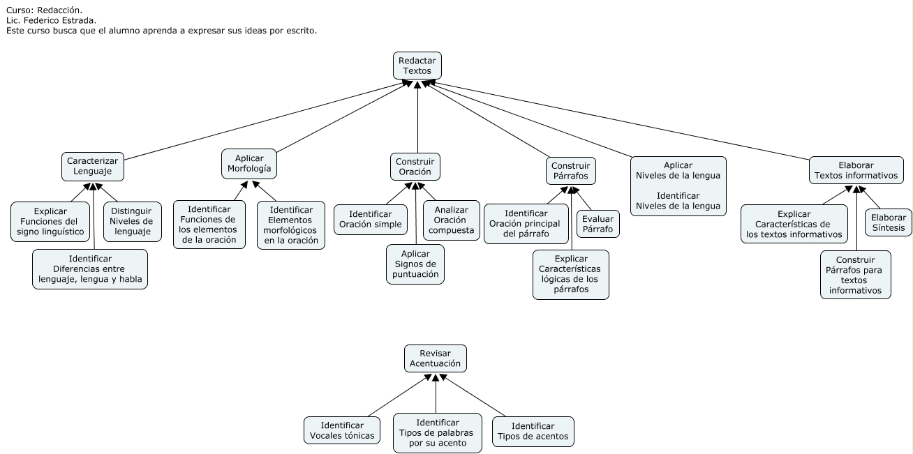 Este Cmap, tiene información relacionada con: Curso Redacción, Elaborar Textos informativos ???? Redactar Textos, Identificar Elementos morfológicos en la oración ???? Aplicar Morfología, Construir Párrafos ???? Redactar Textos, Evaluar Párrafo ???? Construir Párrafos, Identificar Oración simple ???? Construir Oración, Elaborar Síntesis ???? Elaborar Textos informativos, Identificar Oración principal del párrafo ???? Construir Párrafos, Explicar Funciones del signo linguístico ???? Caracterizar Lenguaje, Aplicar Niveles de la lengua Identificar Niveles de la lengua ???? Redactar Textos, Construir Oración ???? Redactar Textos, Distinguir Niveles de lenguaje ???? Caracterizar Lenguaje, Identificar Diferencias entre lenguaje, lengua y habla ???? Caracterizar Lenguaje, Identificar Tipos de palabras por su acento ???? Revisar Acentuación, Construir Párrafos para textos informativos ???? Elaborar Textos informativos, Identificar Funciones de los elementos de la oración ???? Aplicar Morfología, Caracterizar Lenguaje ???? Redactar Textos, Explicar Características lógicas de los párrafos ???? Construir Párrafos, Analizar Oración compuesta ???? Construir Oración, Aplicar Morfología ???? Redactar Textos, Identificar Tipos de acentos ???? Revisar Acentuación