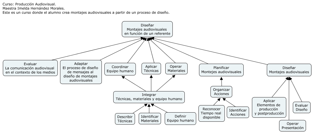 Este Cmap, tiene información relacionada con: Curso Producción Audiovisual, Planificar Montejes audiovisuales ???? Diseñar Montajes audiovisuales en función de un referente, Integrar Técnicas, materiales y equipo humano ???? Coordinar Equipo humano, Evaluar La comunicación audiovisual en el contexto de los medios ???? Diseñar Montajes audiovisuales en función de un referente, Aplicar Técnicas ???? Diseñar Montajes audiovisuales en función de un referente, Operar Presentación ???? Diseñar Montajes audiovisuales, Identificar Acciones ???? Organizar Acciones, Diseñar Montajes audiovisuales ???? Diseñar Montajes audiovisuales en función de un referente, Operar Materiales ???? Diseñar Montajes audiovisuales en función de un referente, Integrar Técnicas, materiales y equipo humano ???? Operar Materiales, Coordinar Equipo humano ???? Diseñar Montajes audiovisuales en función de un referente, Reconocer Tiempo real disponible ???? Organizar Acciones, Aplicar Elementos de producción y postproducción ???? Diseñar Montajes audiovisuales, Organizar Acciones ???? Planificar Montejes audiovisuales, Identificar Materiales ???? Integrar Técnicas, materiales y equipo humano, Definir Equipo humano ???? Integrar Técnicas, materiales y equipo humano, Adaptar El proceso de diseño de mensajes al diseño de montajes audiovisuales ???? Diseñar Montajes audiovisuales en función de un referente, Integrar Técnicas, materiales y equipo humano ???? Aplicar Técnicas, Describir Técnicas ???? Integrar Técnicas, materiales y equipo humano, Evaluar Diseño ???? Diseñar Montajes audiovisuales