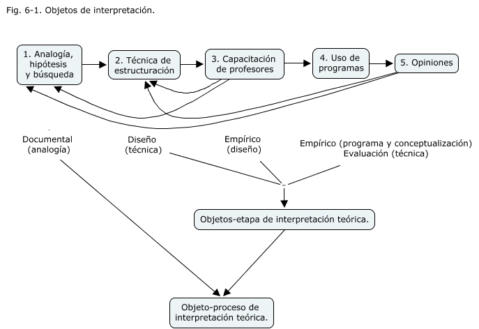 Este Cmap, tiene información relacionada con: Fig 6-1. Objetos de interpretación, 3. Capacitación de profesores ???? 1. Analogía, hipótesis y búsqueda, 3. Capacitación de profesores ???? 4. Uso de programas, 1. Analogía, hipótesis y búsqueda ???? 2. Técnica de estructuración, Diseño (técnica) . Objetos-etapa de interpretación teórica., 2. Técnica de estructuración ???? 3. Capacitación de profesores, 5. Opiniones ???? 2. Técnica de estructuración, Objetos-etapa de interpretación teórica. ???? Objeto-proceso de interpretación teórica., 3. Capacitación de profesores ???? 2. Técnica de estructuración, 5. Opiniones ???? 1. Analogía, hipótesis y búsqueda, Documental (analogía) ???? Objeto-proceso de interpretación teórica., Empírico (diseño) . Objetos-etapa de interpretación teórica., 4. Uso de programas ???? 5. Opiniones, Empírico (programa y conceptualización) Evaluación (técnica) . Objetos-etapa de interpretación teórica.