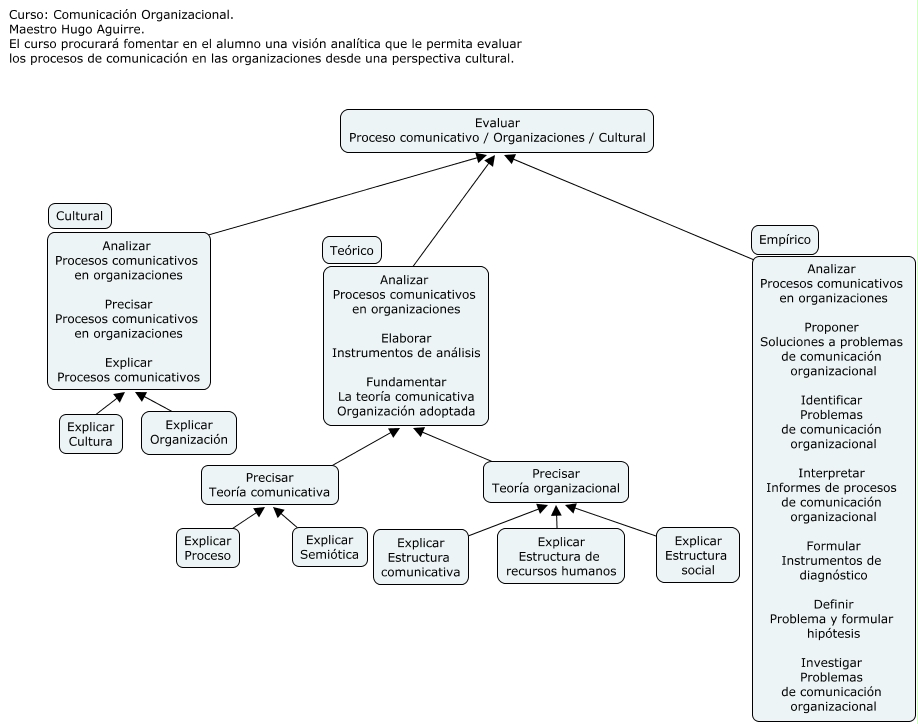 Este Cmap, tiene información relacionada con: Curso Comunicación Organizacional, Analizar Procesos comunicativos en organizaciones Elaborar Instrumentos de análisis Fundamentar La teoría comunicativa Organización adoptada ???? Evaluar Proceso comunicativo / Organizaciones / Cultural, Explicar Semiótica ???? Precisar Teoría comunicativa, Analizar Procesos comunicativos en organizaciones Proponer Soluciones a problemas de comunicación organizacional Identificar Problemas de comunicación organizacional Interpretar Informes de procesos de comunicación organizacional Formular Instrumentos de diagnóstico Definir Problema y formular hipótesis Investigar Problemas de comunicación organizacional ???? Evaluar Proceso comunicativo / Organizaciones / Cultural, Explicar Estructura comunicativa ???? Precisar Teoría organizacional, Explicar Organización ???? Analizar Procesos comunicativos en organizaciones Precisar Procesos comunicativos en organizaciones Explicar Procesos comunicativos, Explicar Cultura ???? Analizar Procesos comunicativos en organizaciones Precisar Procesos comunicativos en organizaciones Explicar Procesos comunicativos, Analizar Procesos comunicativos en organizaciones Precisar Procesos comunicativos en organizaciones Explicar Procesos comunicativos ???? Evaluar Proceso comunicativo / Organizaciones / Cultural, Explicar Proceso ???? Precisar Teoría comunicativa, Precisar Teoría comunicativa ???? Analizar Procesos comunicativos en organizaciones Elaborar Instrumentos de análisis Fundamentar La teoría comunicativa Organización adoptada, Explicar Estructura social ???? Precisar Teoría organizacional, Precisar Teoría organizacional ???? Analizar Procesos comunicativos en organizaciones Elaborar Instrumentos de análisis Fundamentar La teoría comunicativa Organización adoptada, Explicar Estructura de recursos humanos ???? Precisar Teoría organizacional