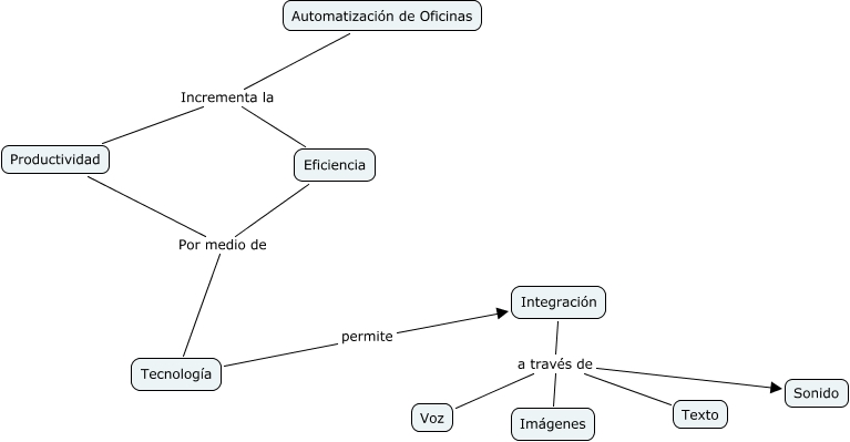 Este mapa conceptual tiene información relacionada a: Automatización de oficinas, Productividad Por medio de Tecnología, Integración a través de Sonido, Automatización de Oficinas Incrementa la Eficiencia, Integración a través de Imágenes, Integración a través de Voz, Integración a través de Texto, Eficiencia Por medio de Tecnología, Automatización de Oficinas Incrementa la Productividad, Tecnología permite Integración
