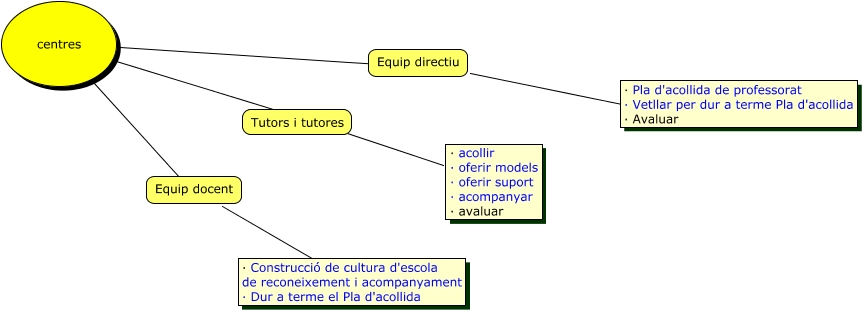 centres, centres ???? Equip docent, Equip docent ???? · Construcció de cultura d'escola de reconeixement i acompanyament · Dur a terme el Pla d'acollida, centres ???? Equip directiu, centres ???? · acollir · oferir models · oferir suport · acompanyar · avaluar, centres ???? Tutors i tutores, Equip directiu ???? · Pla d'acollida de professorat · Vetllar per dur a terme Pla d'acollida · Avaluar, centres ???? Equip docent