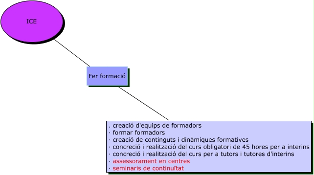 ICE 1, Fer formació ???? . creació d'equips de formadors · formar formadors · creació de continguts i dinàmiques formatives · concreció i realització del curs obligatori de 45 hores per a interins · concreció i realització del curs per a tutors i tutores d'interins · assessorament en centres · seminaris de continuïtat, ICE ???? Fer formació