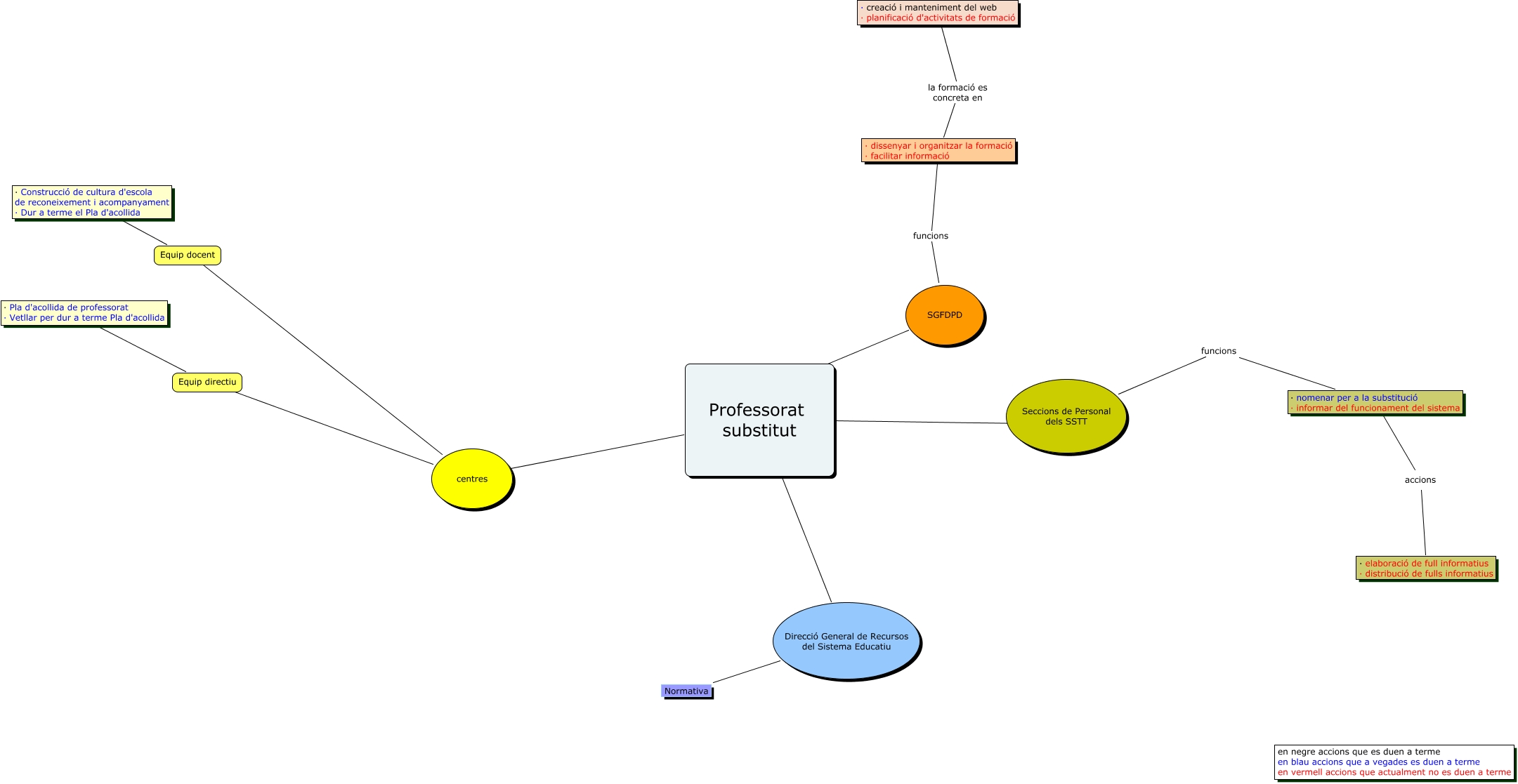 professorat substitud curta durada, Equip directiu ???? · Pla d'acollida de professorat · Vetllar per dur a terme Pla d'acollida, Professorat substitut Direcció General de Recursos del Sistema Educatiu Normativa, · nomenar per a la substitució · informar del funcionament del sistema accions · elaboració de full informatius · distribució de fulls informatius, Professorat substitut ???? centres, centres ???? Equip docent, centres ???? Equip directiu, Equip docent ???? · Construcció de cultura d'escola de reconeixement i acompanyament · Dur a terme el Pla d'acollida, SGFDPD funcions · dissenyar i organitzar la formació · facilitar informació, centres ???? Equip docent, · dissenyar i organitzar la formació · facilitar informació la formació es concreta en · creació i manteniment del web · planificació d'activitats de formació
