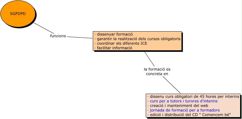 SGFP 1, · dissenyar formació · garantir la realització dels cursos obligatoris · coordinar els diferents ICE · facilitar informació la formació es concreta en · disseny curs obligatori de 45 hores per interins · curs per a tutors i turores d'interins · creació i manteniment del web · jornada de formació per a formadors · edició i distribució del CD " Comencem bé", SGFDPD funcions · dissenyar formació · garantir la realització dels cursos obligatoris · coordinar els diferents ICE · facilitar informació