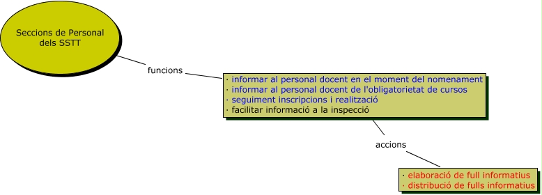 SGPD SSTT, · informar al personal docent en el moment del nomenament · informar al personal docent de l'obligatorietat de cursos · seguiment inscripcions i realització · facilitar informació a la inspecció accions · elaboració de full informatius · distribució de fulls informatius, Seccions de Personal dels SSTT funcions · informar al personal docent en el moment del nomenament · informar al personal docent de l'obligatorietat de cursos · seguiment inscripcions i realització · facilitar informació a la inspecció