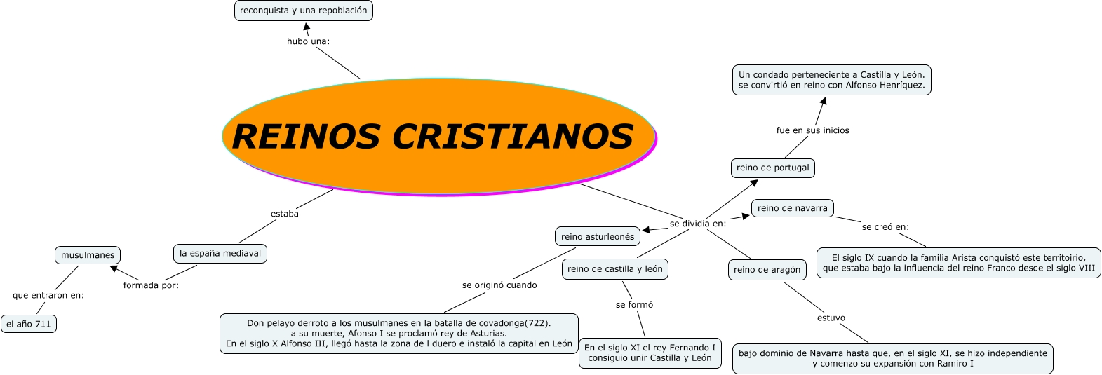 Este mapa conceptual tiene información relacionada a: Javier Mármol Vidal Nº14 2ºA, REINOS CRISTIANOS se dividia en: reino de portugal, reino asturleonés se originó cuando Don pelayo derroto a los musulmanes en la batalla de covadonga(722). a su muerte, Afonso I se proclamó rey de Asturias. En el siglo X Alfonso III, llegó hasta la zona de l duero e instaló la capital en León, REINOS CRISTIANOS se dividia en: reino de aragón, musulmanes que entraron en: el año 711, reino de castilla y león se formó En el siglo XI el rey Fernando I consiguio unir Castilla y León, REINOS CRISTIANOS se dividia en: reino asturleonés, reino de portugal fue en sus inicios Un condado perteneciente a Castilla y León. se convirtió en reino con Alfonso Henríquez., REINOS CRISTIANOS se dividia en: reino de navarra, reino de navarra se creó en: El siglo IX cuando la familia Arista conquistó este territoirio, que estaba bajo la influencia del reino Franco desde el siglo VIII, REINOS CRISTIANOS se dividia en: reino de castilla y león