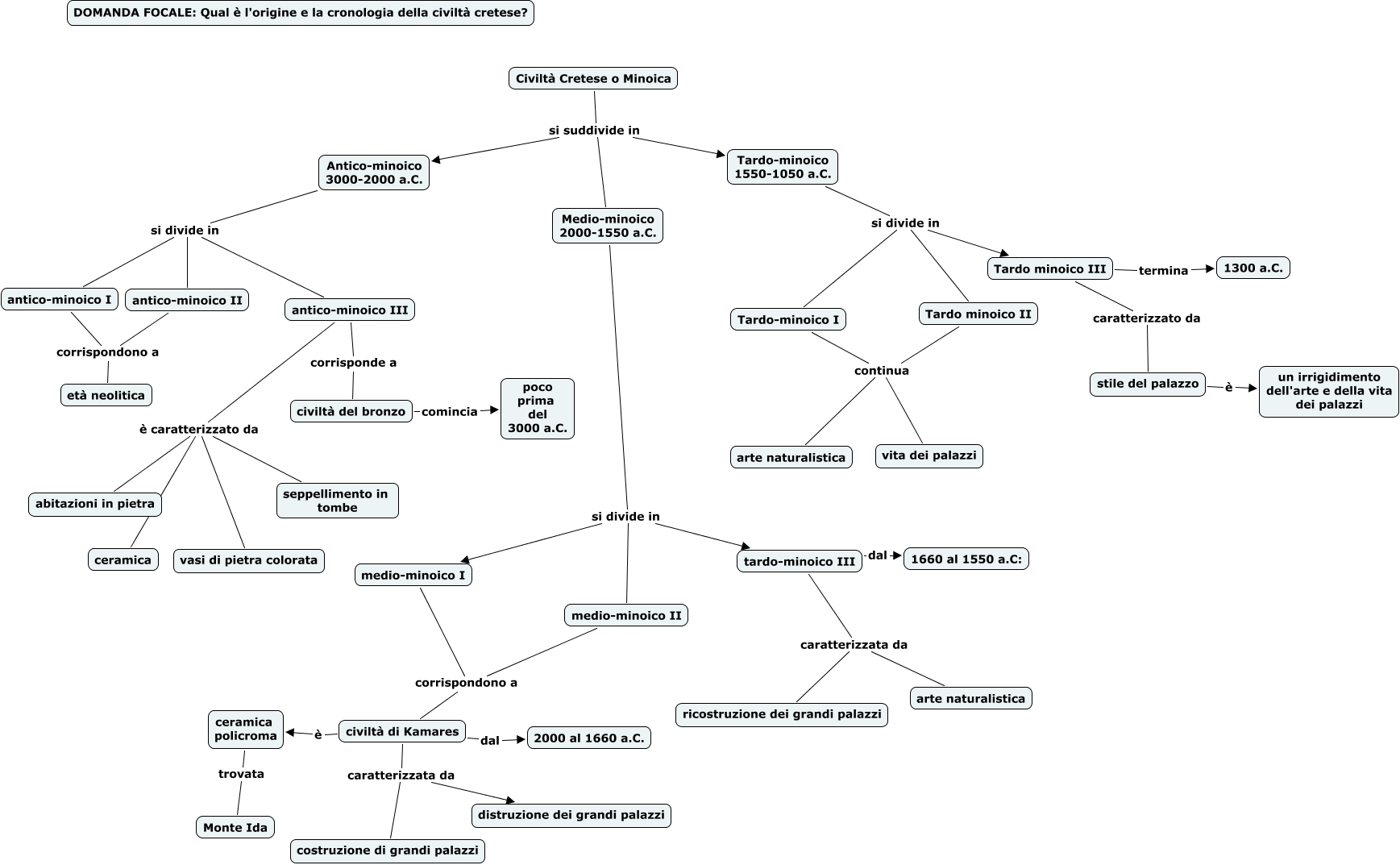 La Civiltà Minoica, civiltà di Kamares è ceramica policroma, civiltà del bronzo comincia poco prima del 3000 a.C., Tardo minoico II continua vita dei palazzi, tardo-minoico III caratterizzata da ricostruzione dei grandi palazzi, Civiltà Cretese o Minoica si suddivide in Tardo-minoico 1550-1050 a.C., Civiltà Cretese o Minoica si suddivide in Antico-minoico 3000-2000 a.C., Antico-minoico 3000-2000 a.C. si divide in antico-minoico I, stile del palazzo è un irrigidimento dell'arte e della vita dei palazzi, Tardo-minoico 1550-1050 a.C. si divide in Tardo-minoico I, medio-minoico II corrispondono a civiltà di Kamares