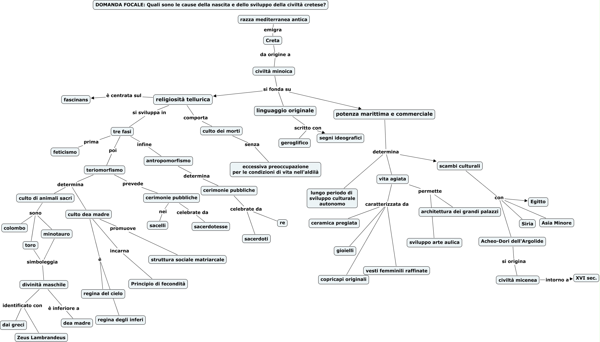 Caratteri della civiltà cretese e micenea, Creta da origine a civiltà minoica, culto di animali sacri sono toro, civiltà micenea intorno a XVI sec., razza mediterranea antica emigra Creta, vita agiata permette sviluppo arte aulica, linguaggio originale scritto con geroglifico, religiosità tellurica è centrata sul fascinans, culto dea madre incarna Principio di fecondità, tre fasi poi teriomorfismo, vita agiata caratterizzata da gioielli