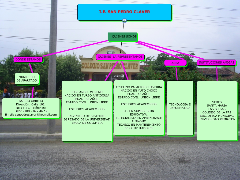 Este Cmap, tiene información relacionada con: TESELINO PALACIOS CHAVERRA, QUIENES LA REPRESENTAMOS ???? TESELINO PALACIOS CHAVERRA NACIDO EN YUTO CHOCO EDAD: 45 AÑOS ESTADO CIVIL: UNION LIBRE ESTUDIOS ACADEMICOS L.C. EN SUPERVISION EDUCATIVA. ESPECIALISTA EN APRENDIZAJE AUTNOMO TECNICO EN MANTENIMIENTO DE COMPUTADORES, AREA ???? TECNOLOGIA E INFORMATICA, I.E. SAN PEDRO CLAVER QUIENES SOMOS QUIENES LA REPRESENTAMOS, AREA ???? TECNOLOGIA E INFORMATICA, I.E. SAN PEDRO CLAVER QUIENES SOMOS INSTITUCIONES AMIGAS, QUIENES LA REPRESENTAMOS ???? JOSE ANGEL MORENO NACIDO EN TURBO ANTIOQUIA EDAD: 38 AÑOS ESTADO CIVIL: UNION LIBRE ESTUDIOS ACADEMICOS INGENIERO DE SISTEMAS EGRESADO DE LA UNIVERSIDAD INCCA DE COLOMBIA, AREA ???? TECNOLOGIA E INFORMATICA, I.E. SAN PEDRO CLAVER QUIENES SOMOS QUIENES LA REPRESENTAMOS, I.E. SAN PEDRO CLAVER QUIENES SOMOS QUIENES LA REPRESENTAMOS, I.E. SAN PEDRO CLAVER QUIENES SOMOS AREA, DONDE ESTAMOS ???? MUNICIPIO DE APARTADO, AREA ???? TECNOLOGIA E INFORMATICA, I.E. SAN PEDRO CLAVER QUIENES SOMOS DONDE ESTAMOS, MUNICIPIO DE APARTADO LUGAR BARRIO OBRERO Dirección: Calle 102 No.14-81, Teléfonos: 827 9189 - 827 46 19 Email: sanpedroclaver@hotmail.com, I.E. SAN PEDRO CLAVER QUIENES SOMOS QUIENES LA REPRESENTAMOS, INSTITUCIONES AMIGAS ???? SEDES SANTA MARIA LAS BRISAS COLEGIO DE LA PAZ BIBLIOTECA MUNICIPAL UNIVERSIDAD REMIGTON
