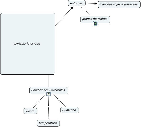 Este mapa conceptual tiene información relacionada a: pyricularia, Condiciones Favorables _ Viento, sintomas _ granos marchitos, Condiciones Favorables _ Humedad, pyricularia oryzae ???? sintomas, pyricularia oryzae ???? Condiciones Favorables, Condiciones Favorables _ temperatura, sintomas _ manchas rojas a grisaceas
