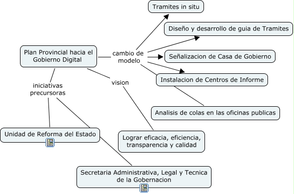 Este Cmap, tiene información relacionada con: Modernizacion del estado, Plan Provincial hacia el Gobierno Digital iniciativas precursoras Unidad de Reforma del Estado, Plan Provincial hacia el Gobierno Digital vision Lograr eficacia, eficiencia, transparencia y calidad, Plan Provincial hacia el Gobierno Digital cambio de modelo Tramites in situ, Plan Provincial hacia el Gobierno Digital cambio de modelo Instalacion de Centros de Informe, Plan Provincial hacia el Gobierno Digital cambio de modelo Analisis de colas en las oficinas publicas, Plan Provincial hacia el Gobierno Digital cambio de modelo Señalizacion de Casa de Gobierno, Plan Provincial hacia el Gobierno Digital cambio de modelo Diseño y desarrollo de guia de Tramites, Plan Provincial hacia el Gobierno Digital iniciativas precursoras Secretaria Administrativa, Legal y Tecnica de la Gobernacion
