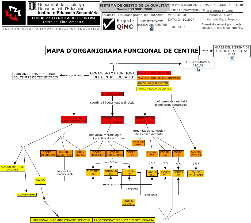 This Concept Map, created with IHMC CmapTools, has information related to: SGQ_MAPcomunicacio_000000, SECRETARIA I ADMINISTRACIO ???? ADMINISTRATRIUS OFICINES, SECRETARIA I ADMINISTRACIO ???? COORD. DE RISCOS, PREFACTURA D'ESTUDIS organitzacio curricular dels ensenyaments COORD. FP, TUTORIES ESO integrades EQUIPS ESO, COORD. BAT ???? EQUIPS BAT, ORGANIGRAMES 010101 veure MAPES DEL SISTEMA DE GESTIÓ DE QUALITAT 0101, DIRECCIO IES coordina i lidera l'equip directiu PREFACTURA D'ESTUDIS, COORD. ACTIVITATS coopera i es coordina amb TUTORIES BAT, COORDINACIO PEDAGOGICA innovacio, metodologia i practica docent CAPS DE DEPT., COORDINACIO PEDAGOGICA innovacio, metodologia i practica docent COORD. LIC, COORDINACIO PEDAGOGICA innovacio, metodologia i practica docent COORD. ORIENTACIÓ, SECRETARIA I ADMINISTRACIO ???? COORD. TIC/TAC, TUTORIES FP integrades EQUIPS FP, COORD. ESO ???? EQUIPS ESO, ORGANIGRAMA FUNCIONAL DEL CENTRE EDUCATIU veure ORGANIGRAMES 010101, SECRETARIA I ADMINISTRACIO ???? CONSERGERIA, TÈCNIC TIC ???? PERSONAL D'ADMINISTRACIÓ SERVEIS, COORD. ACTIVITATS coopera i es coordina amb TUTORIES FP, COORD. QiMC-PE ???? EQUIPS DE MILLORA, PREFACTURA D'ESTUDIS organitzacio curricular dels ensenyaments CAPS DE DEPT.