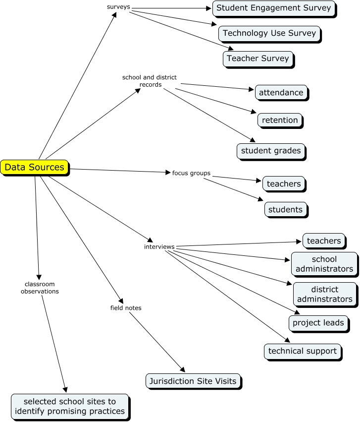 This Concept Map, created with IHMC CmapTools, has information related to: HS - data plan, Data Sources school and district records retention, Data Sources focus groups students, Data Sources school and district records attendance, Data Sources classroom observations selected school sites to identify promising practices, Data Sources interviews school administrators, Data Sources interviews teachers, Data Sources surveys Teacher Survey, Data Sources surveys Technology Use Survey, Data Sources interviews technical support, Data Sources field notes Jurisdiction Site Visits, Data Sources interviews district adminstrators, Data Sources surveys Student Engagement Survey, Data Sources interviews project leads, Data Sources school and district records student grades, Data Sources focus groups teachers