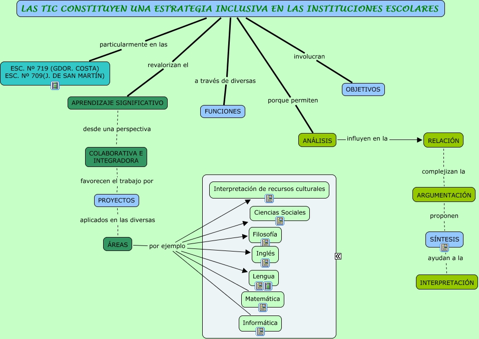 Este Cmap, tiene información relacionada con: PROYECTO TICS, ÁREAS por ejemplo Interpretación de recursos culturales, ÁREAS por ejemplo Informática, SÍNTESIS ayudan a la INTERPRETACIÓN, LAS TIC CONSTITUYEN UNA ESTRATEGIA INCLUSIVA EN LAS INSTITUCIONES ESCOLARES porque permiten ANÁLISIS, ÁREAS por ejemplo Inglés, LAS TIC CONSTITUYEN UNA ESTRATEGIA INCLUSIVA EN LAS INSTITUCIONES ESCOLARES particularmente en las ESC. Nº 719 (GDOR. COSTA) ESC. Nº 709(J. DE SAN MARTÍN), PROYECTOS aplicados en las diversas ÁREAS, LAS TIC CONSTITUYEN UNA ESTRATEGIA INCLUSIVA EN LAS INSTITUCIONES ESCOLARES involucran OBJETIVOS, LAS TIC CONSTITUYEN UNA ESTRATEGIA INCLUSIVA EN LAS INSTITUCIONES ESCOLARES revalorizan el APRENDIZAJE SIGNIFICATIVO, COLABORATIVA E INTEGRADORA favorecen el trabajo por PROYECTOS, ARGUMENTACIÓN proponen SÍNTESIS, ANÁLISIS influyen en la RELACIÓN, ÁREAS por ejemplo Ciencias Sociales, RELACIÓN complejizan la ARGUMENTACIÓN, ÁREAS por ejemplo Lengua, APRENDIZAJE SIGNIFICATIVO desde una perspectiva COLABORATIVA E INTEGRADORA, LAS TIC CONSTITUYEN UNA ESTRATEGIA INCLUSIVA EN LAS INSTITUCIONES ESCOLARES a través de diversas FUNCIONES, ÁREAS por ejemplo Matemática, ÁREAS por ejemplo Filosofía