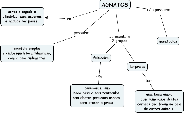 Esse mapa conceitual, produzido no IHMC CmapTools, tem a informação relacionada a: Agnátos, lampreias tem uma boca ampla com numerosos dentes carneos que fixam na pele de outros animais, feiticeira são carnívoras, sua boca possue seis tentaculos, com dentes pequenos usados para atacar a presa, AGNATOS apresentam 2 grupos feiticeira, AGNATOS possuem encefalo simples e endoesqueletocartilaginoso, com cranio rudimentar, AGNATOS apresentam 2 grupos lampreias, AGNATOS não possuem mandibulas, AGNATOS tem corpo alongado e cilindrico, sem escamas e nadadeiras pares.